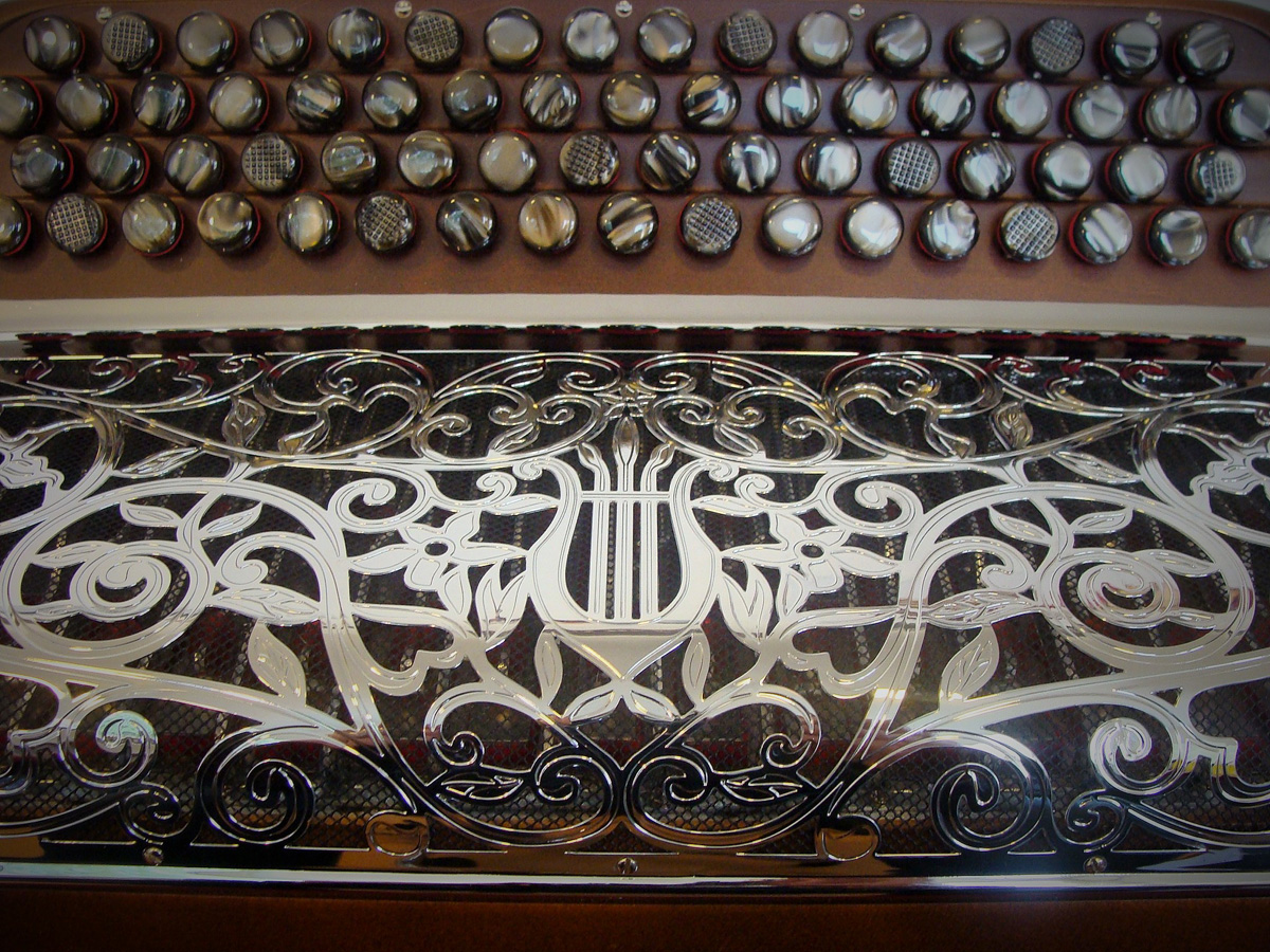 Une étendue de clavier du Mib au Mi aigu (Mib grave au 4ème rang) avec le Do en 3ème position (autre étendue possible sur demande).Basses : 96 basses (108 basses en option) à 4 voix (5 voix en option).