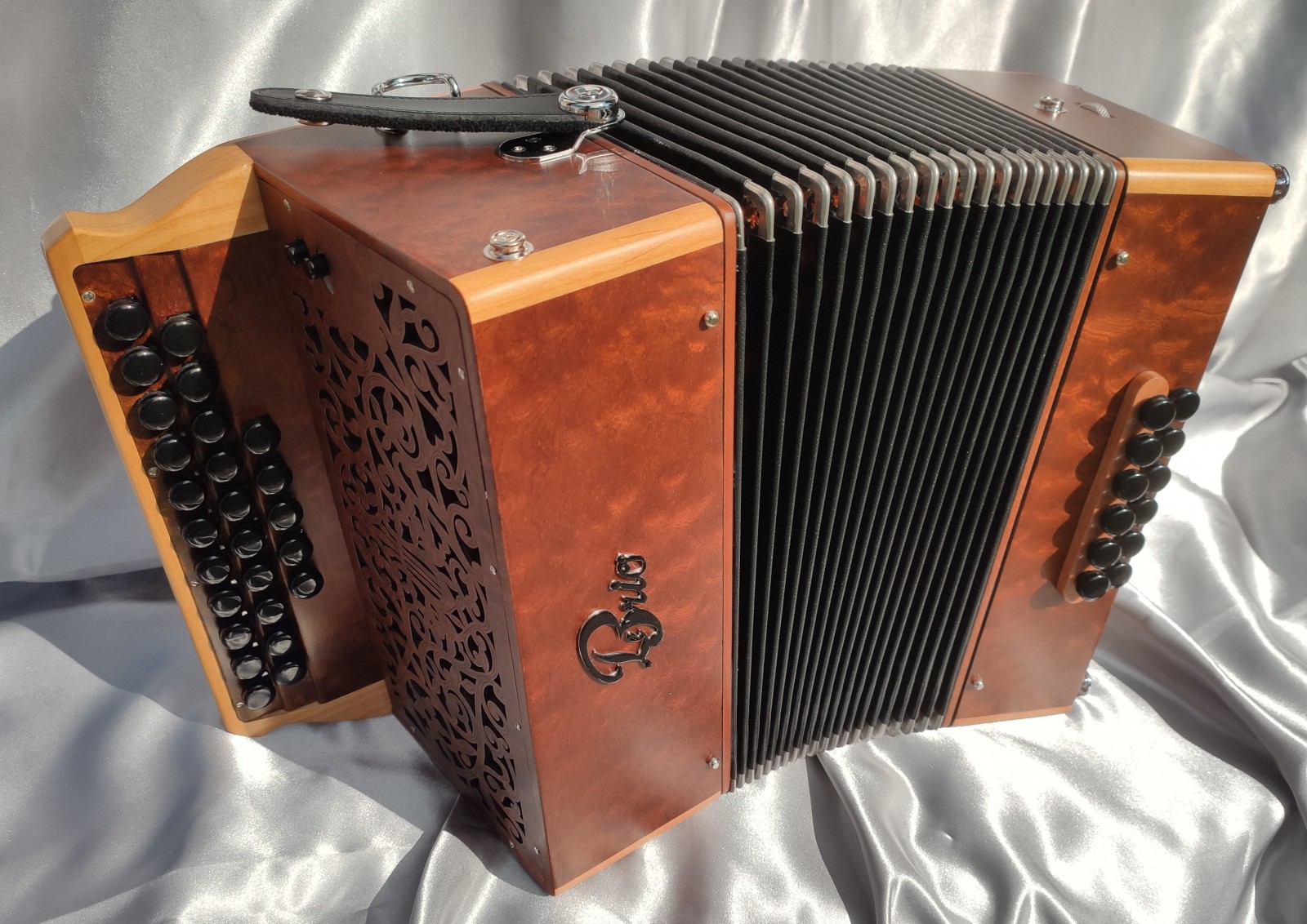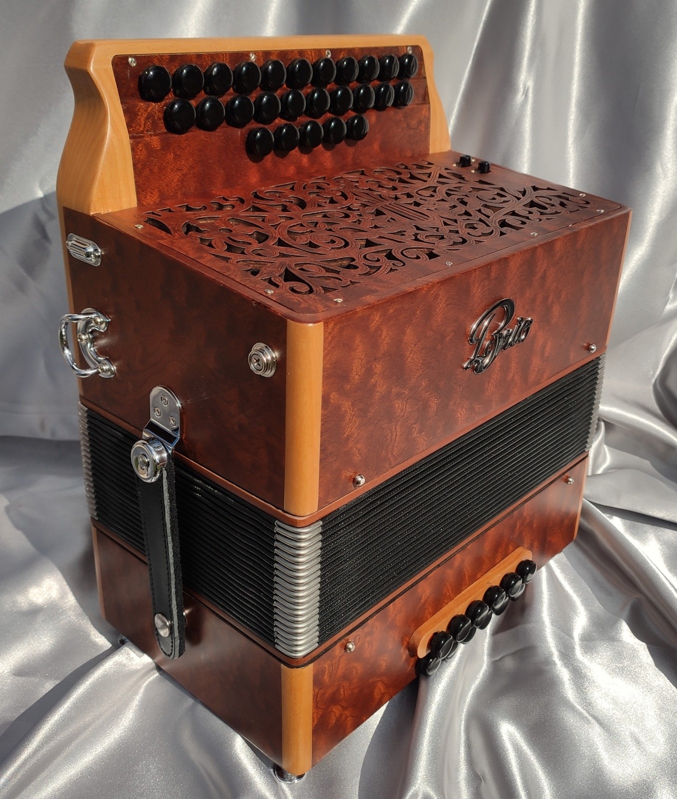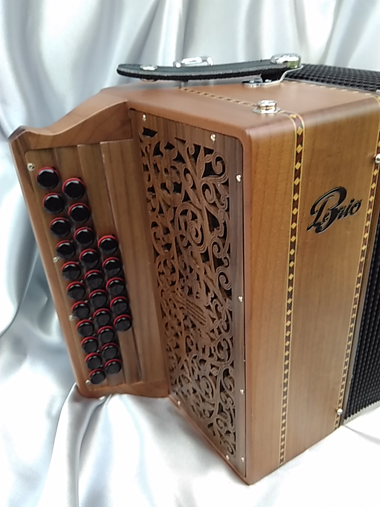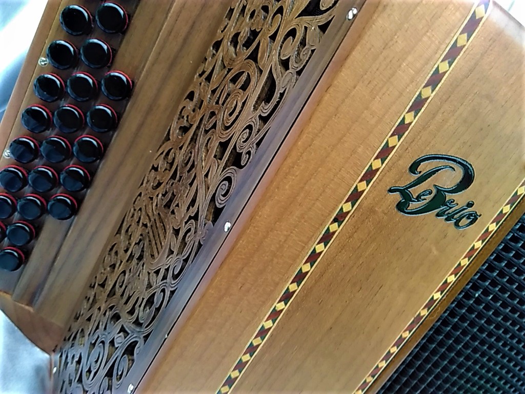 ♫ "Le Brio 2 rangs 1/2 (21 touches + 5 alt) à 3 voix, 12 basses", possède 3 voix au chant avec 3 registres sur la grille permettant les 5 sonorités différentes (2 voix médium, bandonéon, 3 voix plein jeu, Basson, flûte), ainsi qu'un registre main gauche permettant la suppression des tierces.