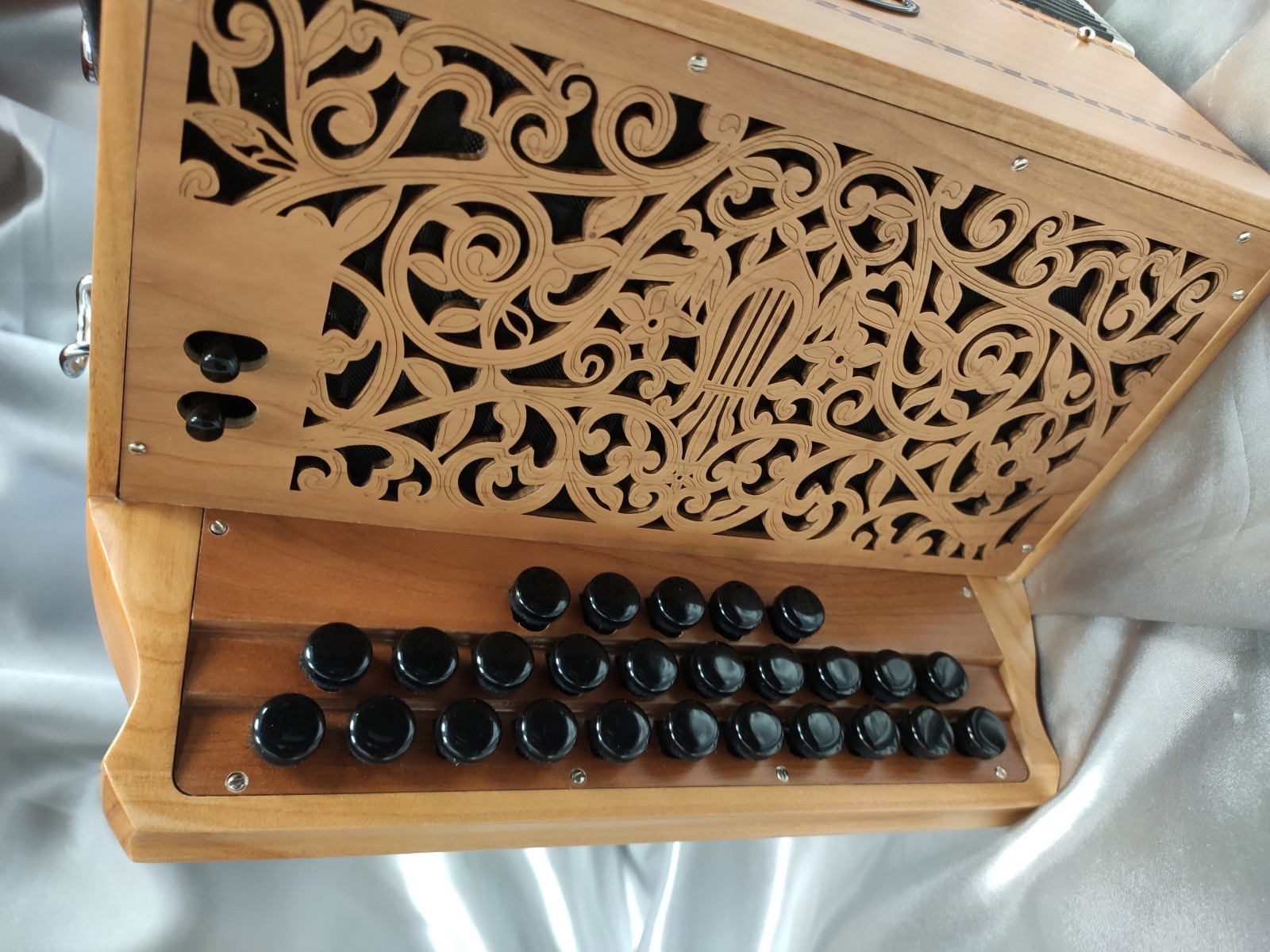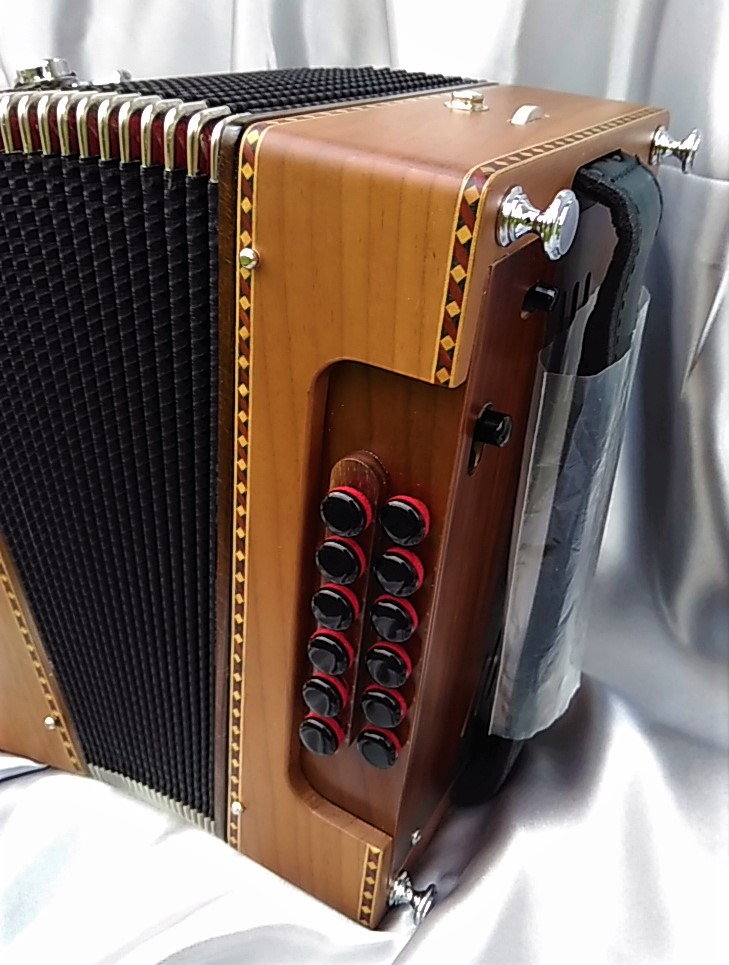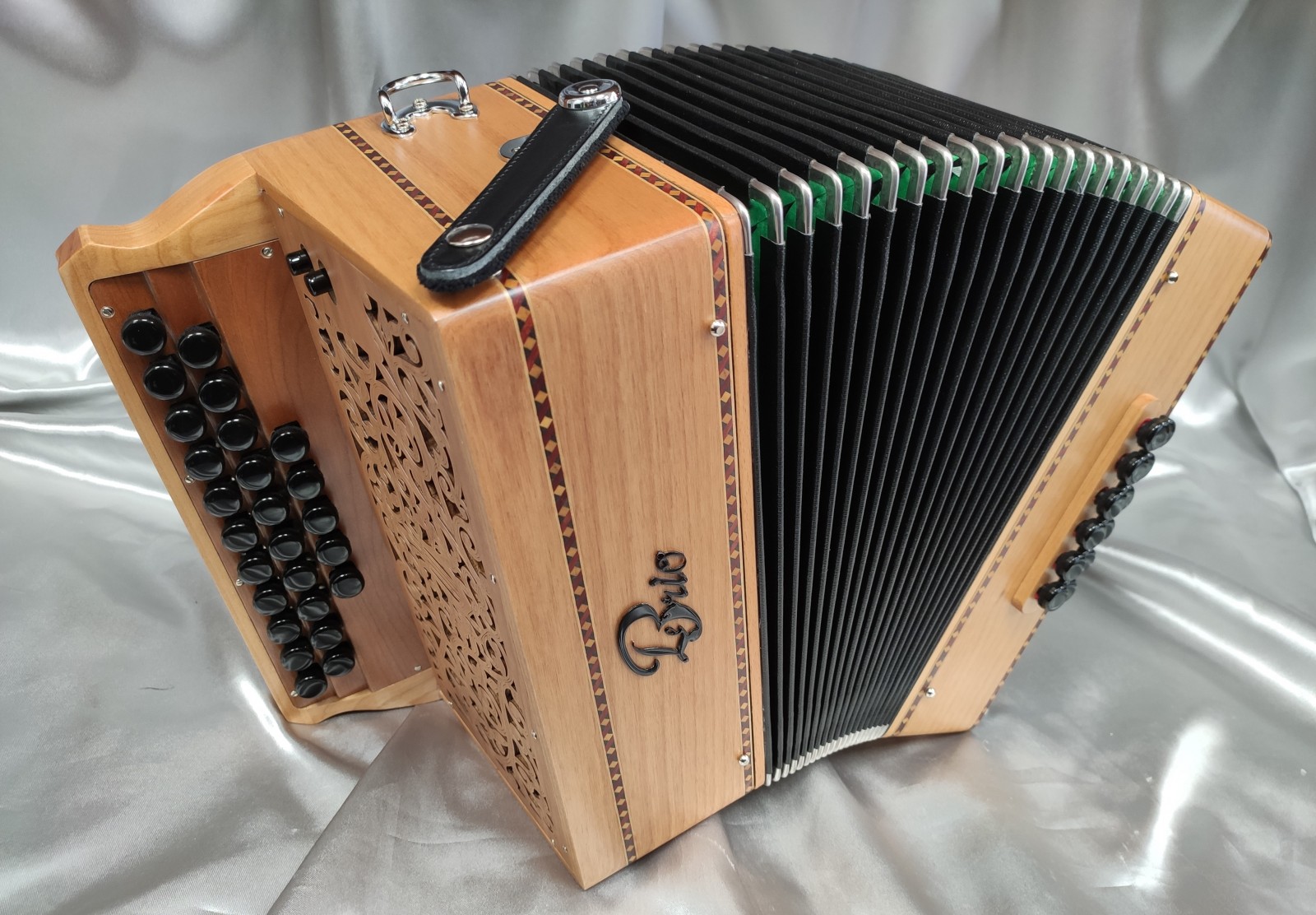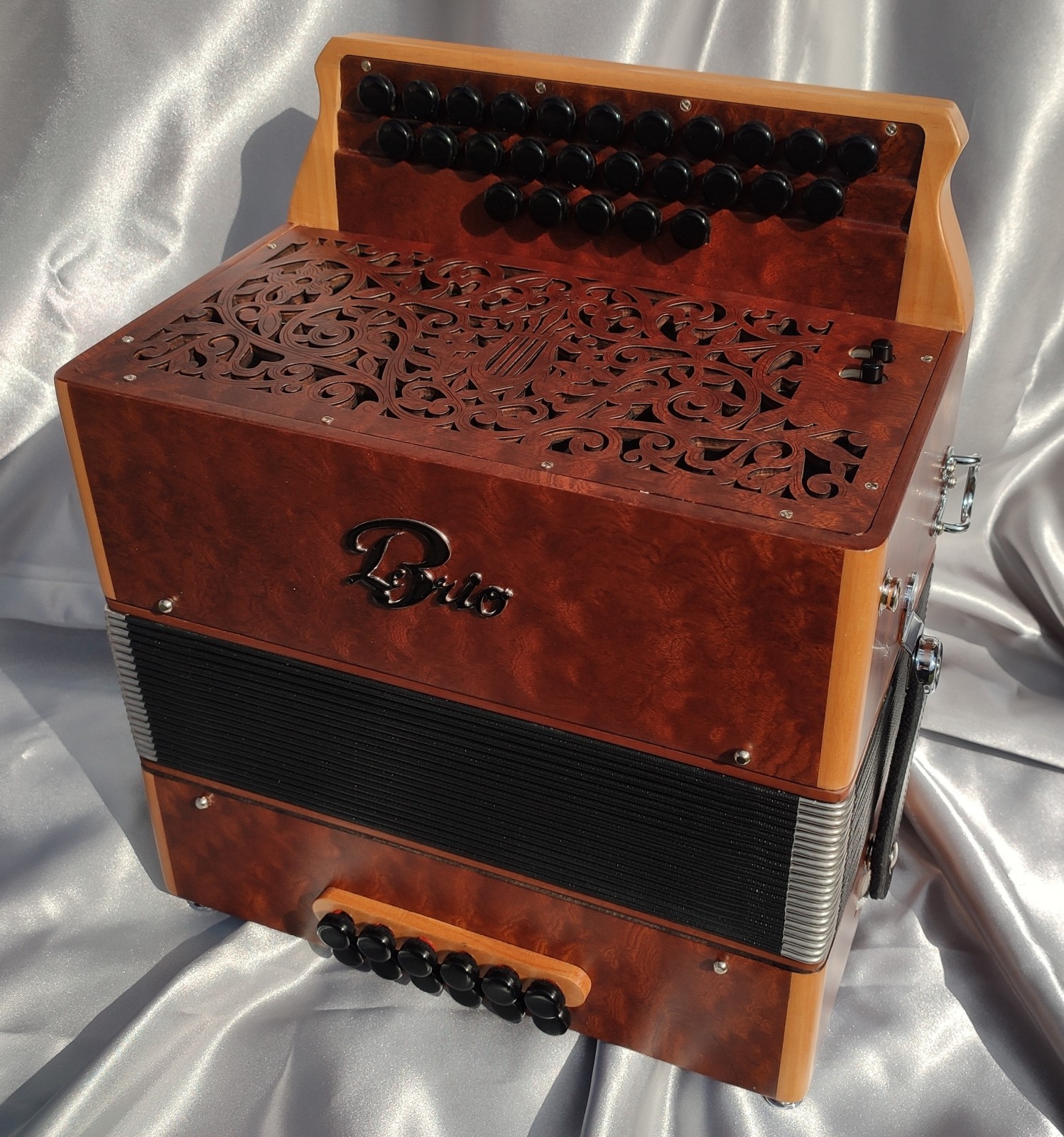 ♫ "Le Brio 2 rangs 1/2 (21 touches + 5 alt) à 3 voix, 12 basses", possède 3 voix au chant avec 3 registres sur la grille permettant les 5 sonorités différentes (2 voix médium, bandonéon, 3 voix plein jeu, Basson, flûte), ainsi qu'un registre main gauche permettant la suppression des tierces.