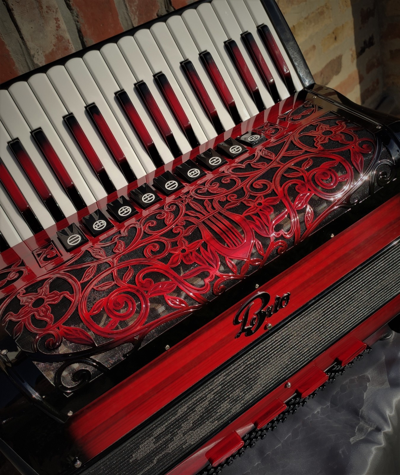 Basses : de 72 basses à 120 basses à 4 voix, 5 voix en option. Mécanique 3/3 (3 rangées de basses et 3 rangées d'accords) ou 2/4 (2 rangées de basses et 4 rangées d'accords) au choix à la commande. De 3 à 7 registres (configuration traditionnelles ou personnalisée possible) avec ou sans registre de coupure.