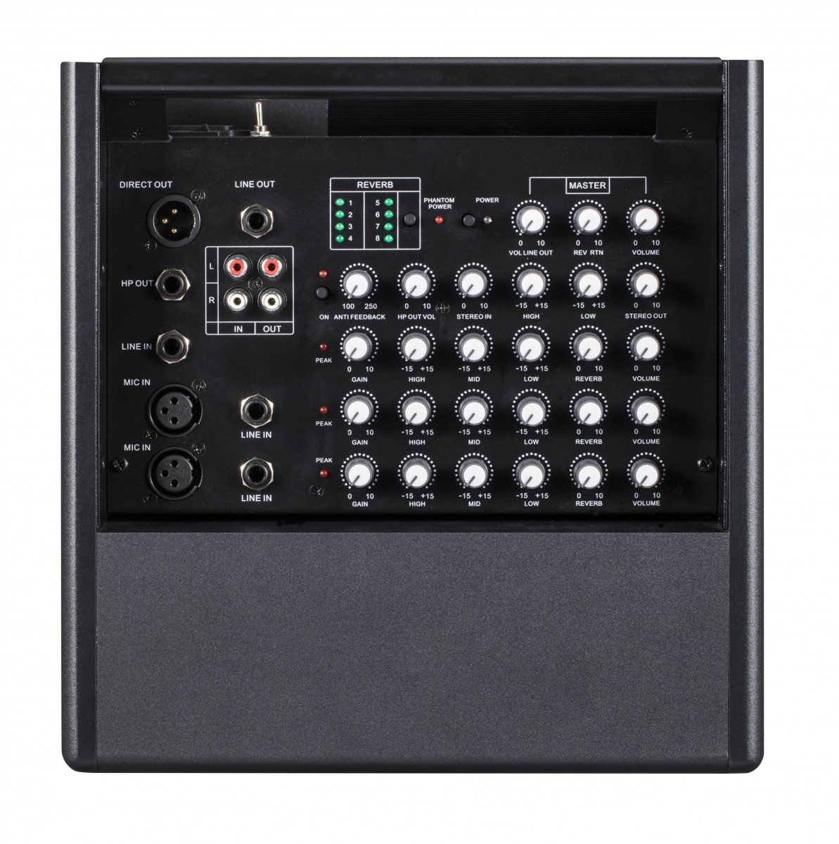Il vous offre aussi une connectique très complète avec plusieurs entrées et sorties symétriques, des équaliseurs 3 bandes, des alimentations fantômes, une réverbe DSP numérique, un anti feed back et un ground lift, afin de connecter vos instruments acoustiques, vos micros dynamiques, vos micros statiques et même une source stéréo en entrée/sortie.