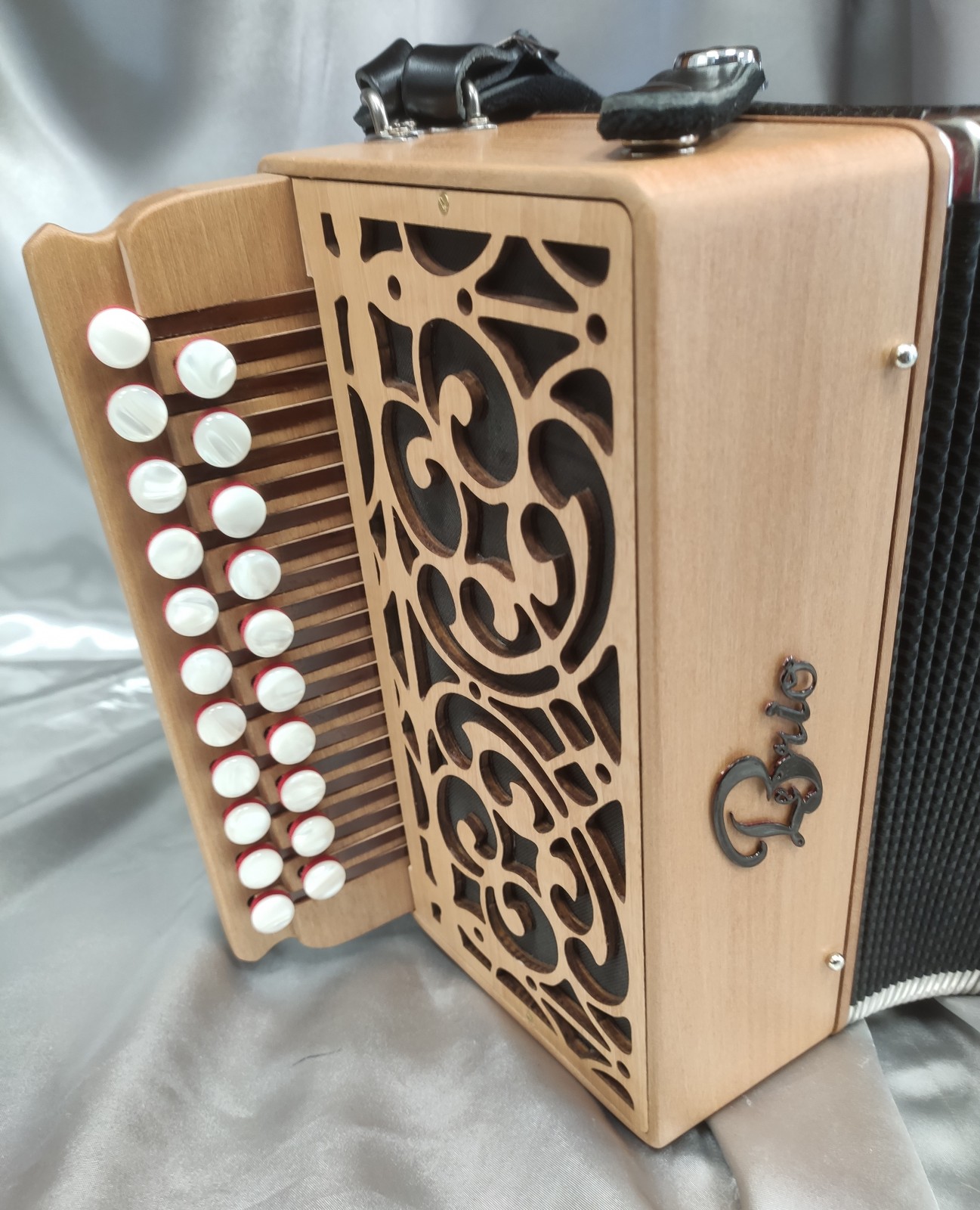 Ses dimensions de 26cm en position de jeu et 15cm de largeur pour 3 kg seulement , font de lui un petit diatonique idéal pour débuter et jouer avec un accordéon compact, léger et en bois massif !