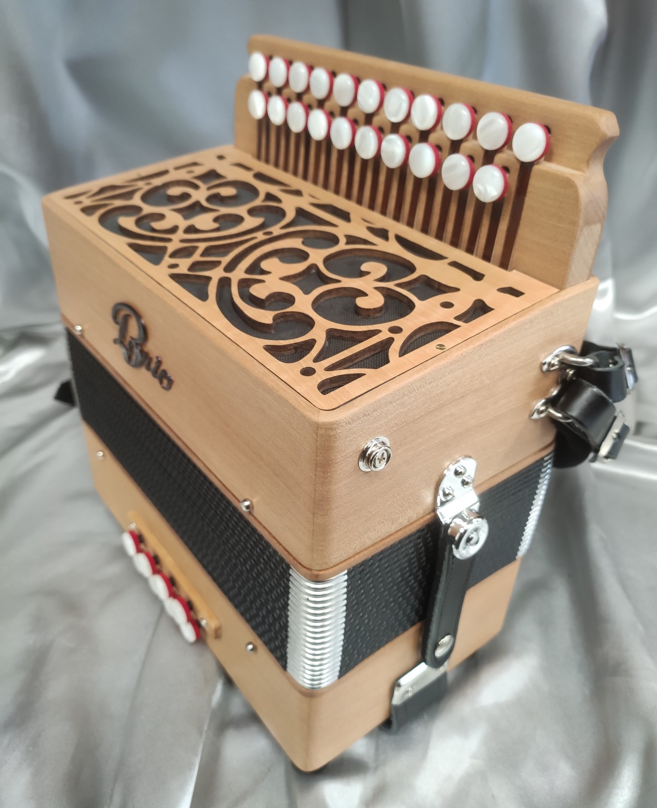 Venez vite découvrir et essayer le "Diato Trad", 2 rangs et 2 voix au chant, pour 21 touches et 8 basses". Modèle en bois massif avec clavier traditionnel au chant. 2 voix medium avec une musique SD (TAM en option).