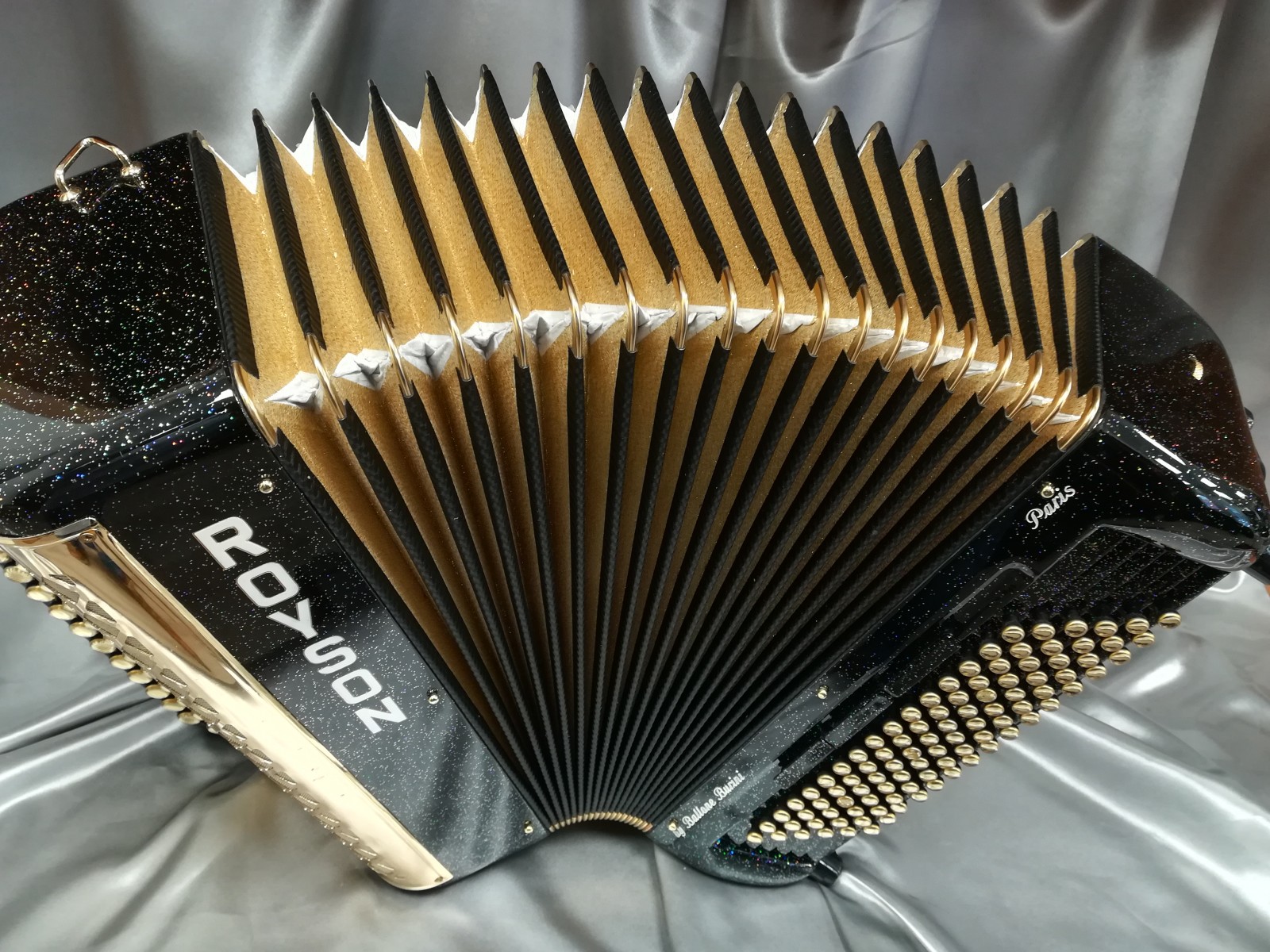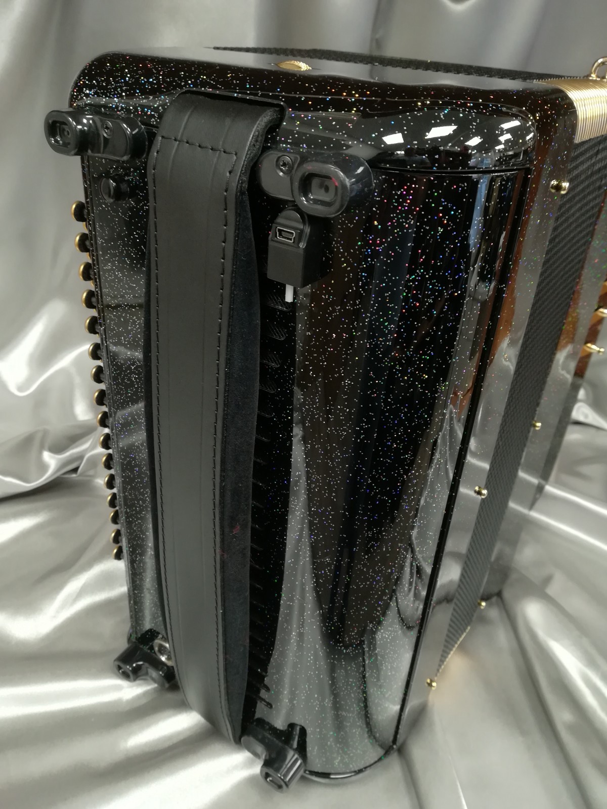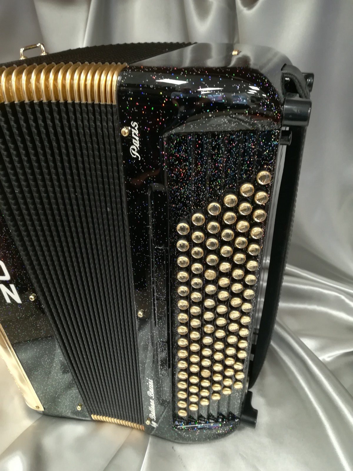 Modèle 3 voix musette noir pailleté avec option or, boutons miroirs à saisir. Modèle équipé Midi Limex neuf avec registres de coupure acoustique.