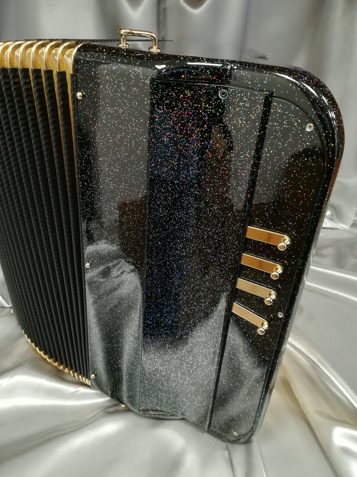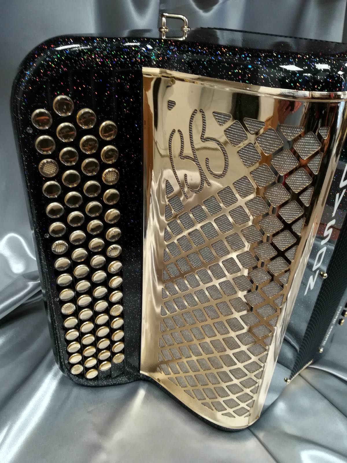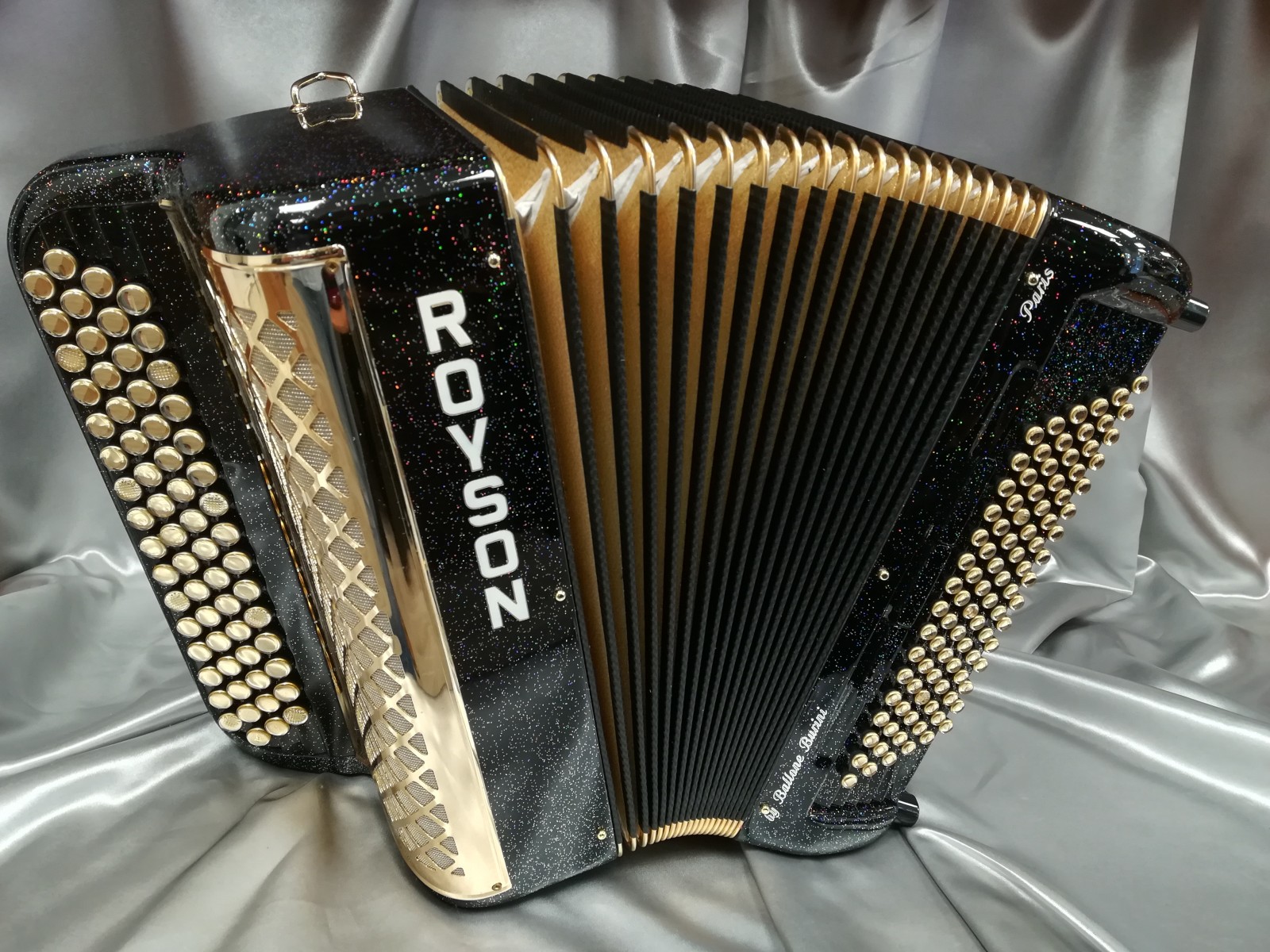 Modèle 3 voix musette noir pailleté avec option or, boutons miroirs à saisir. Modèle équipé Midi Limex neuf avec registres de coupure acoustique.