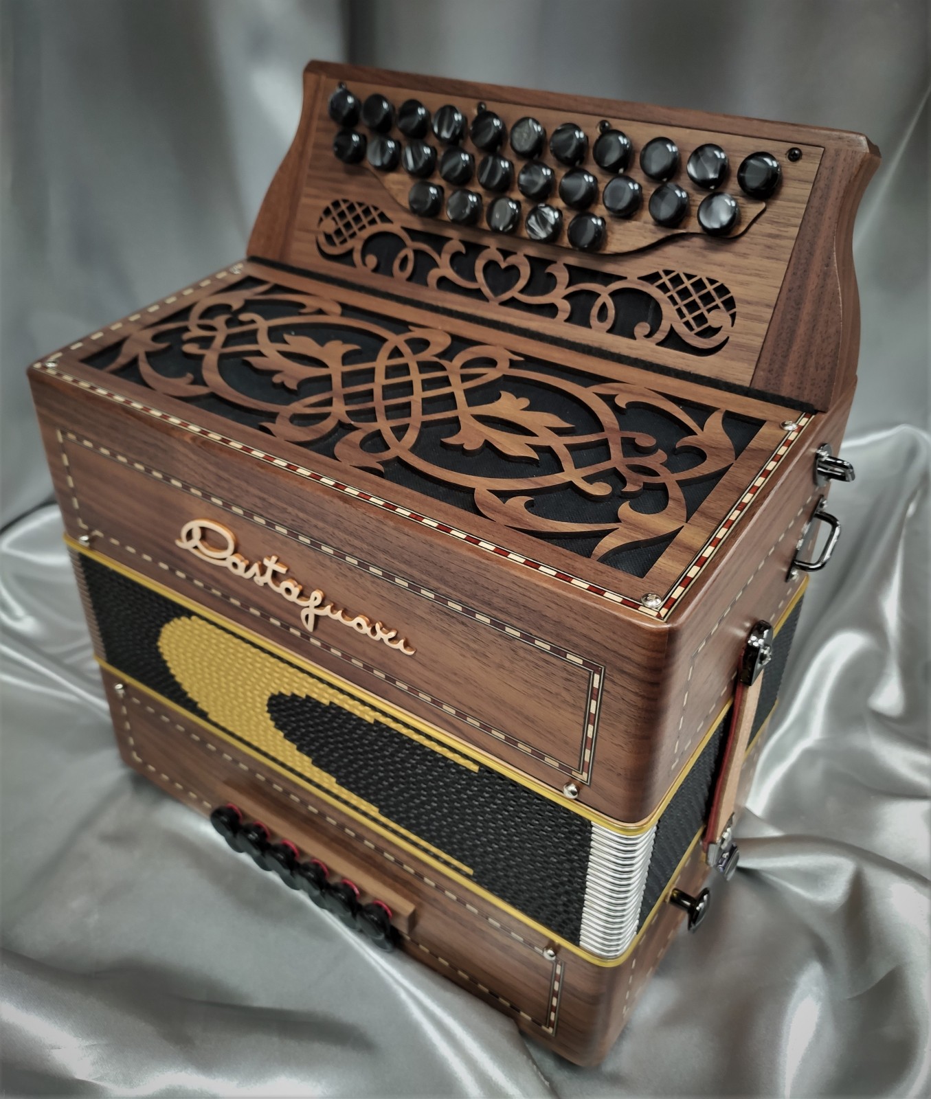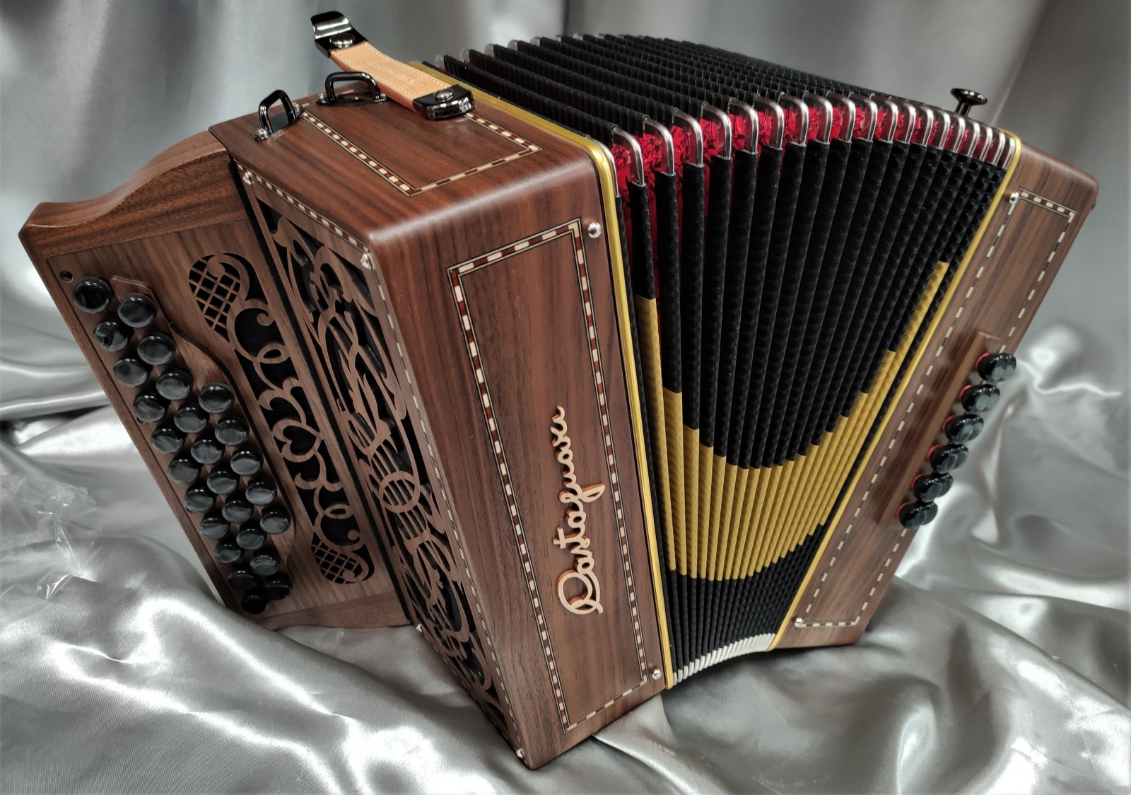 Le Dony est un modèle en bois massif (Noyer ou cerisier) avec 2 rangs 1/2 à 2 voix au chant. 12 basses avec en option, le registres suppression des tierces par tirette.