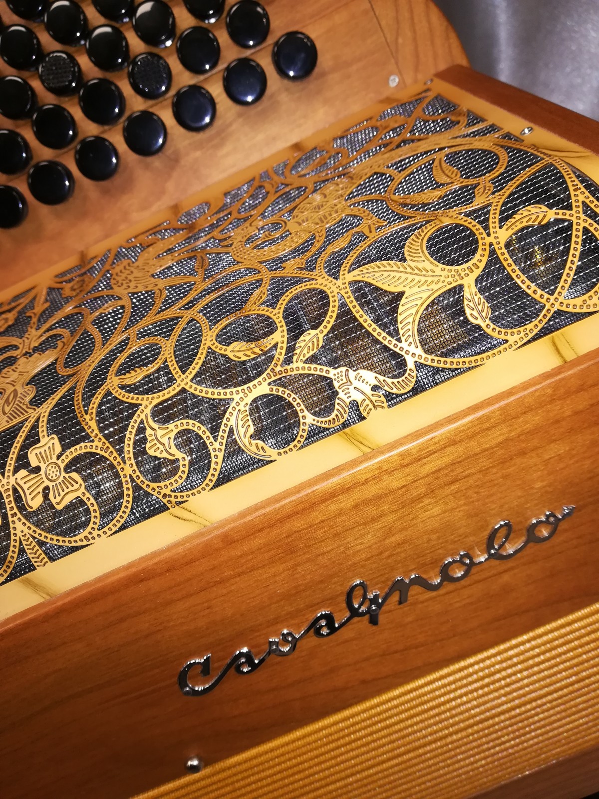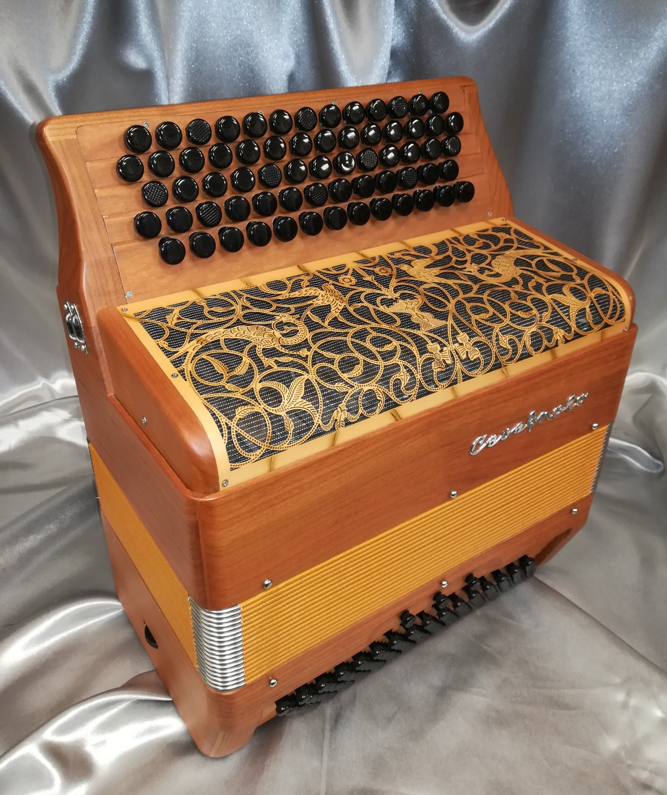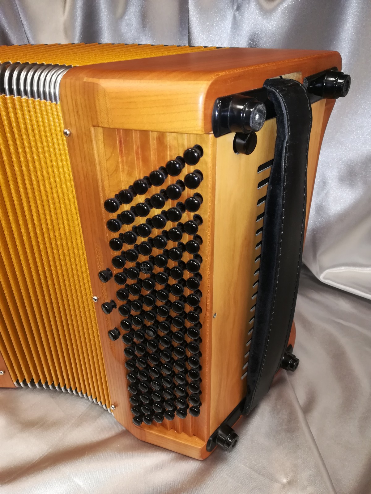 Modèle bois 3 voix. 5 rangées au chant, 96 basse. Etendue au chant de 40 notes (Du Mi au Sol). Modèle avec musique TAM. Fabrication italienne de bonne facture. A saisir !!