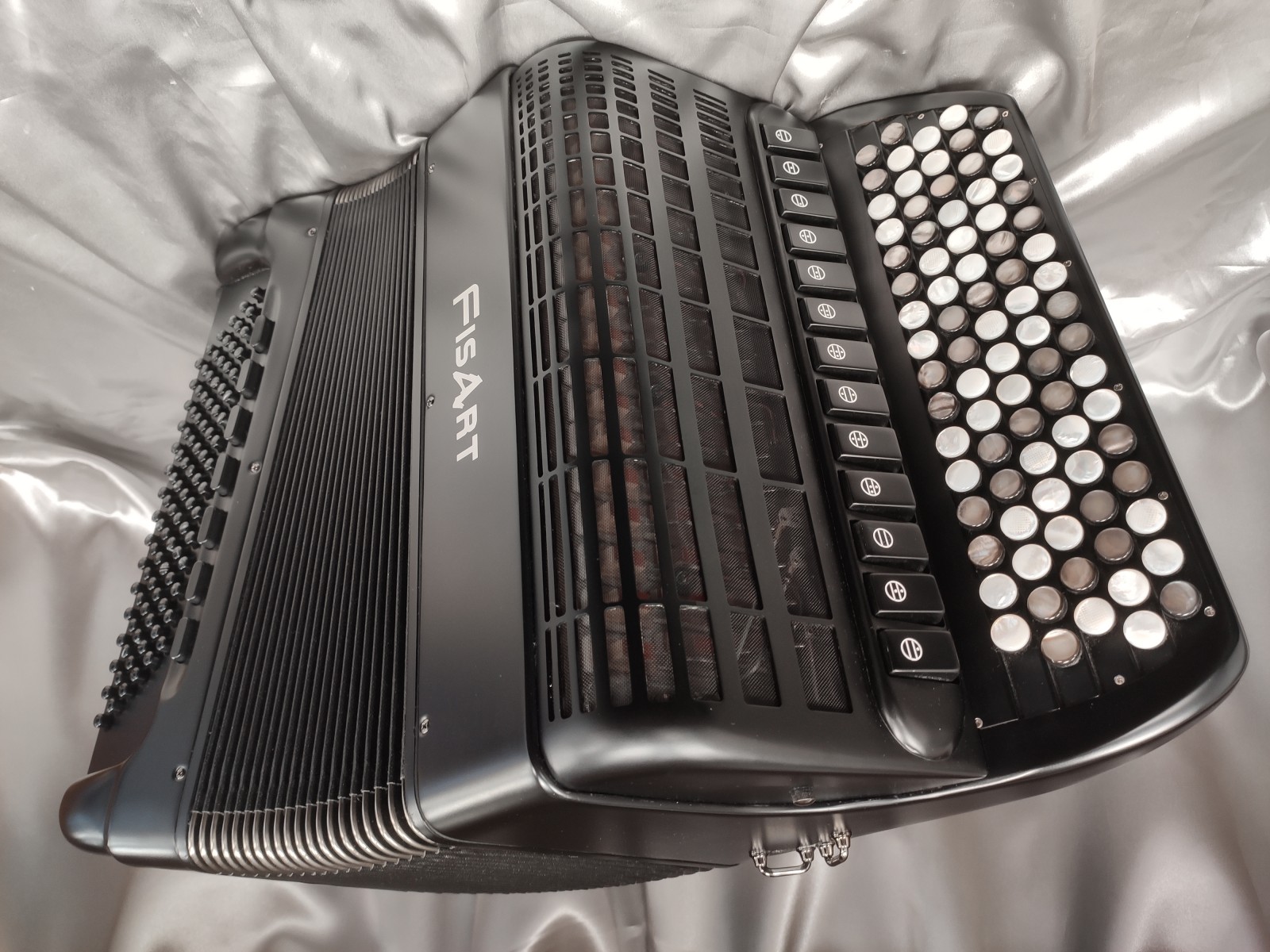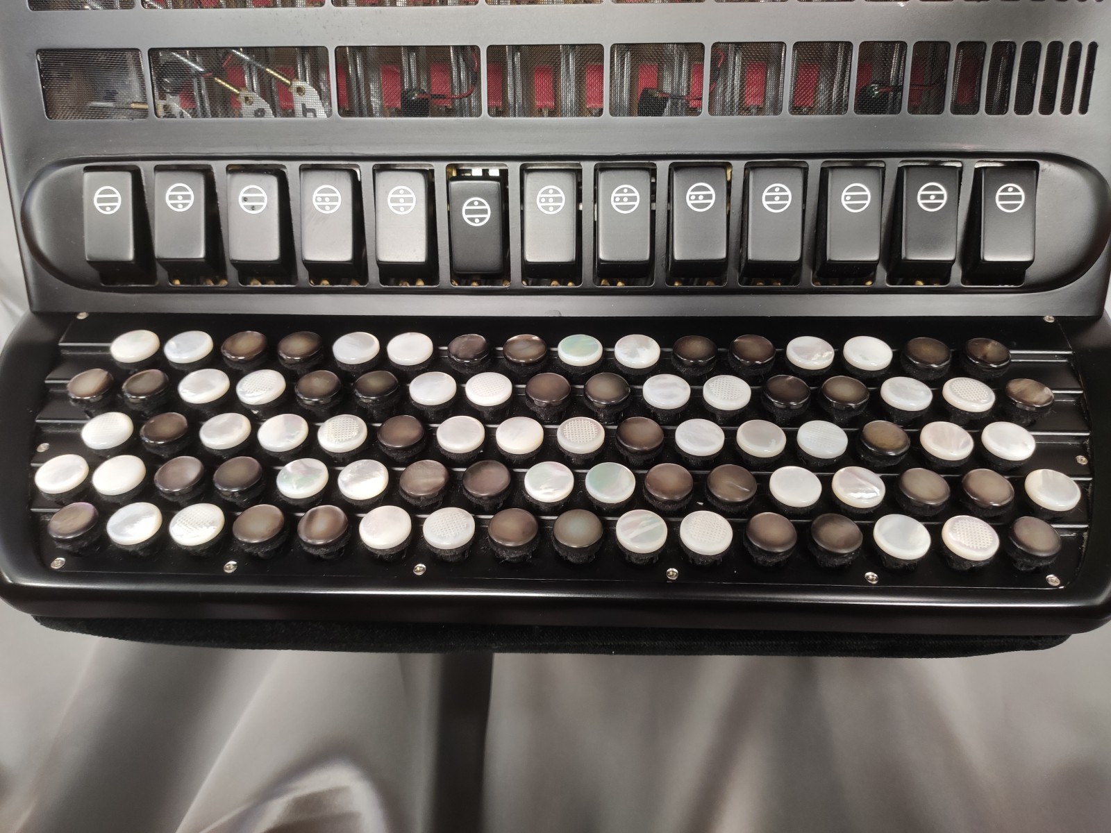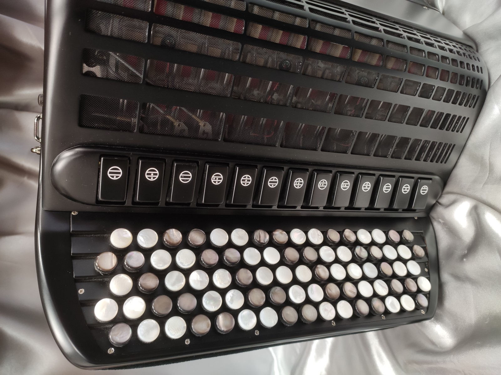 50 notes réelles (82 boutons) pour 5 rangs, étendue Ré#/Mi, qualité des voix : A Mano