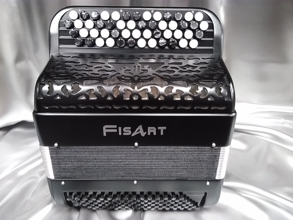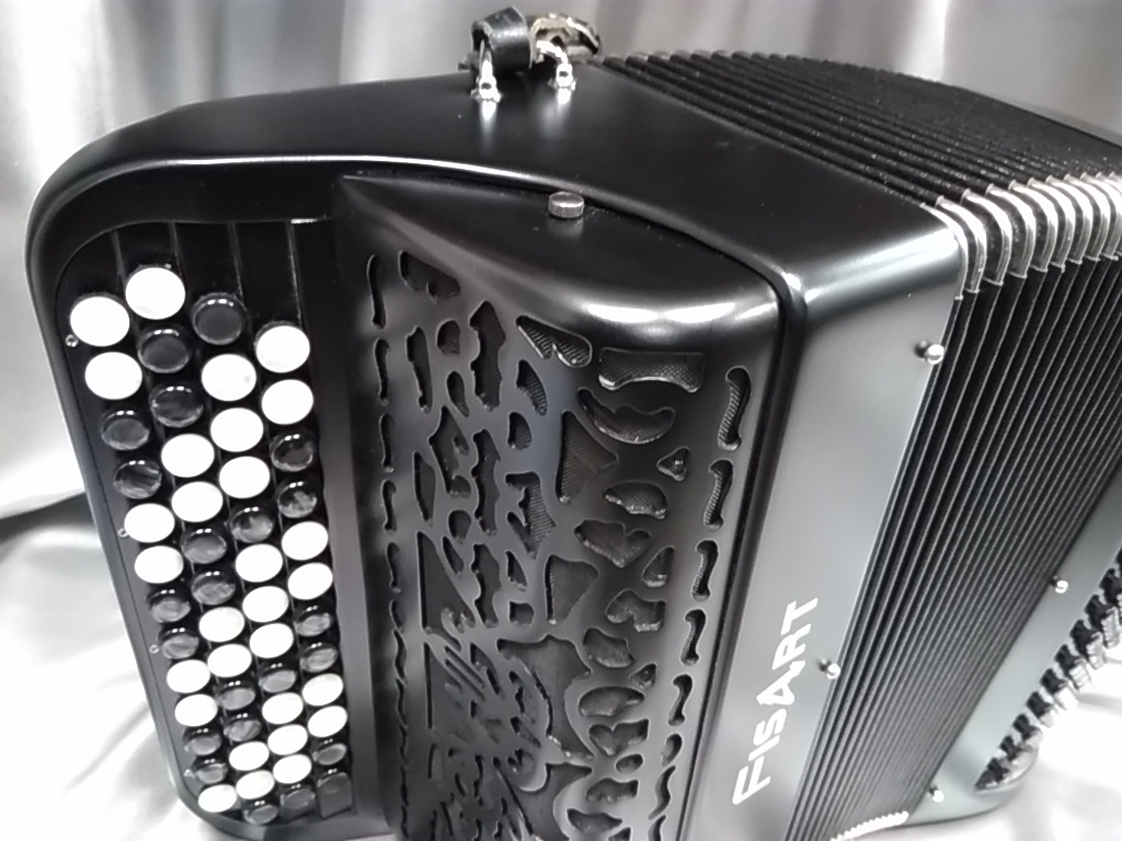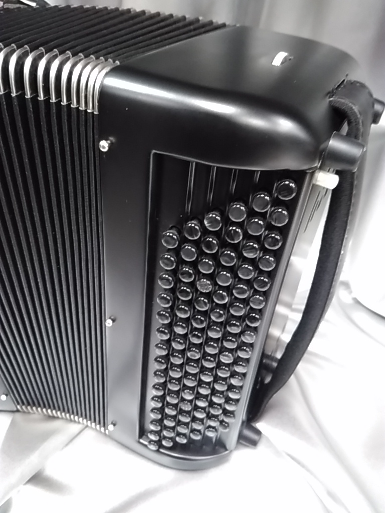 Main droite : 3 voix avec basson, 4 rangs, 40 notes, 92 boutons, 5 registres