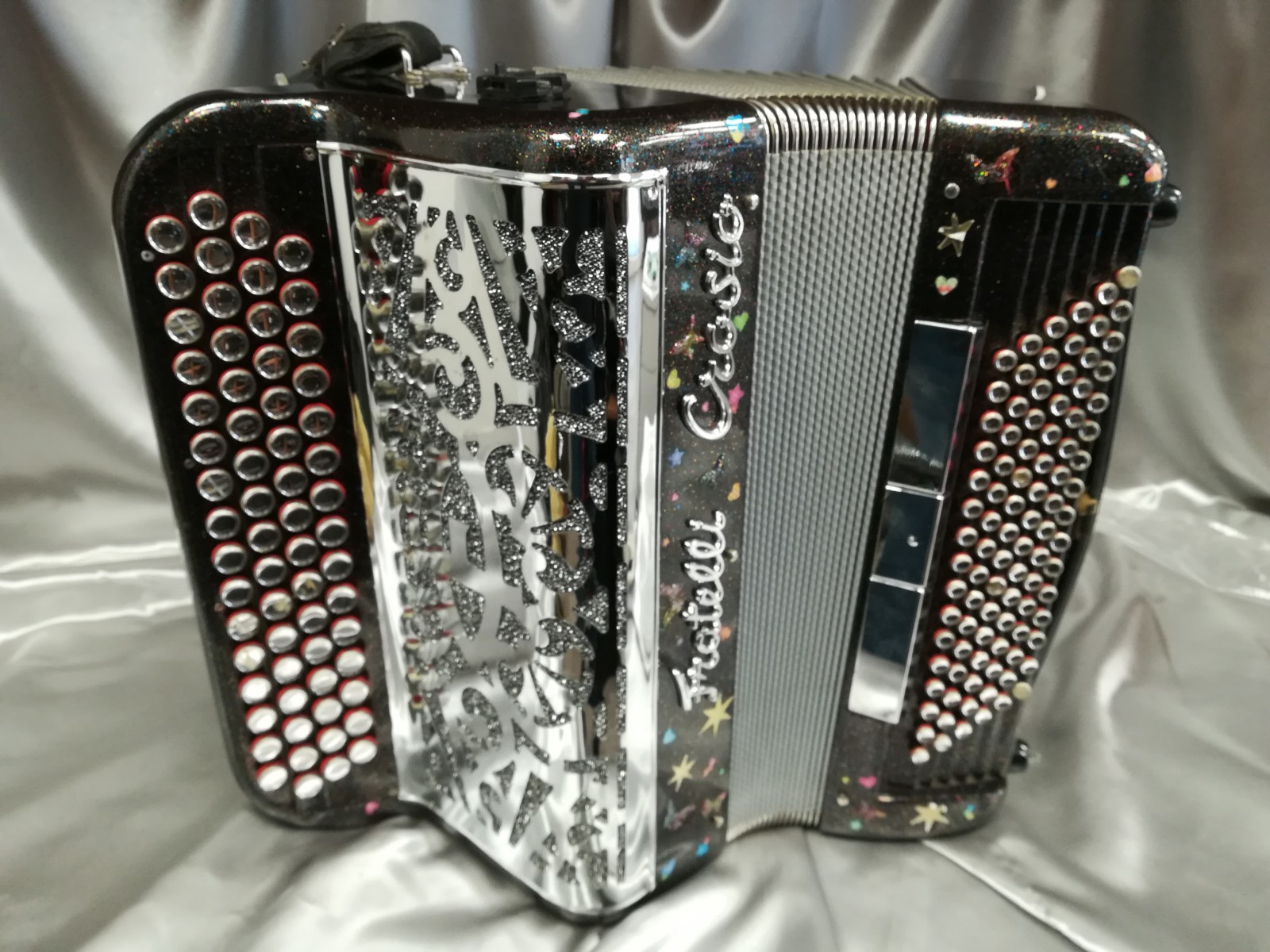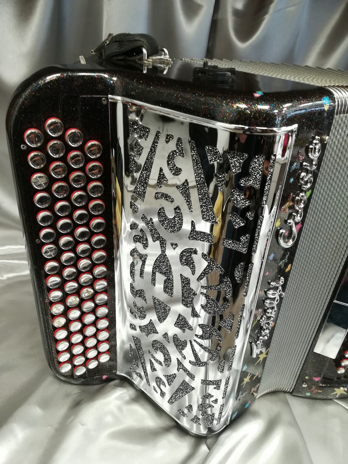 Coloris :noir pailleté, boutons miroirs