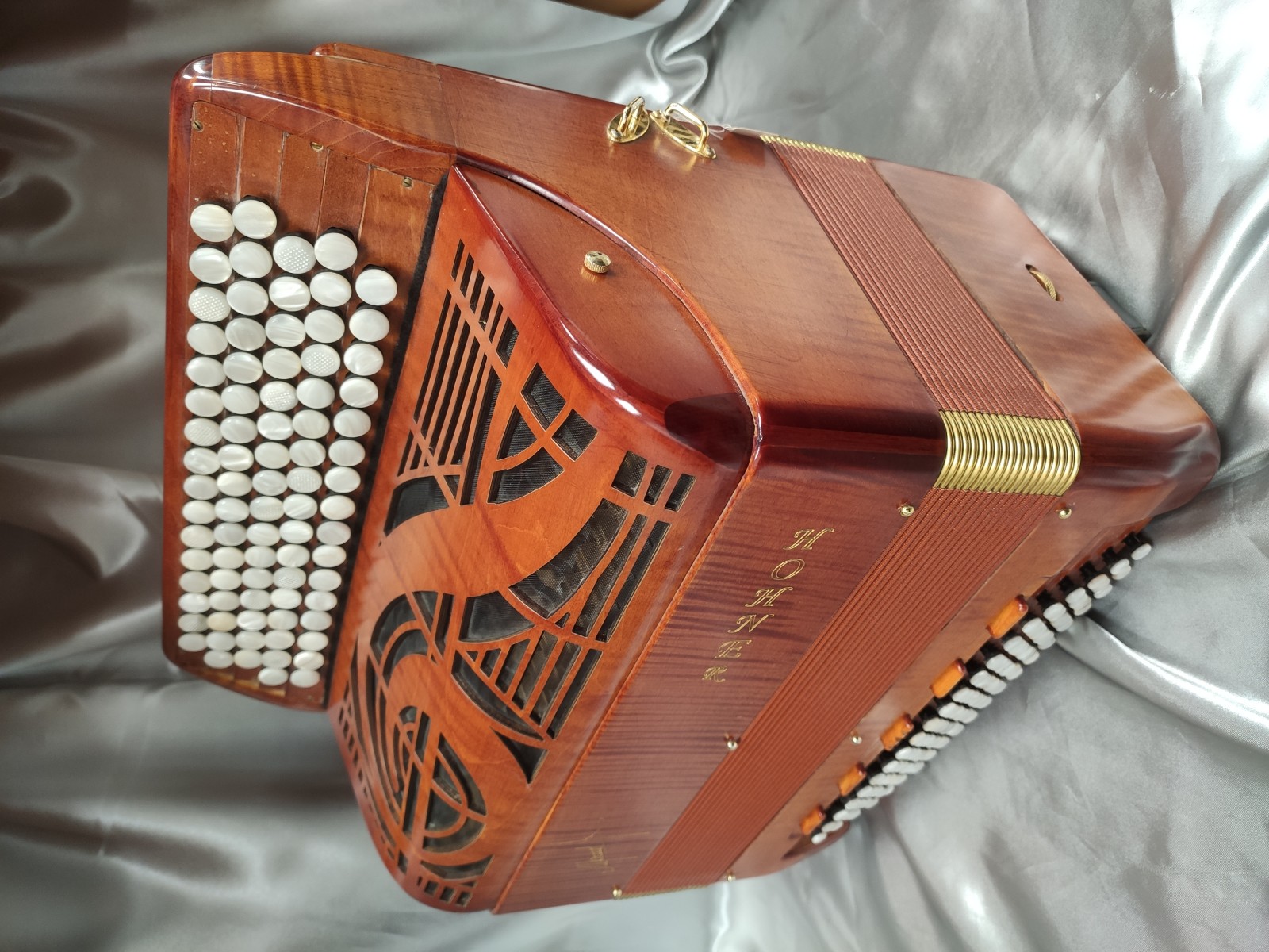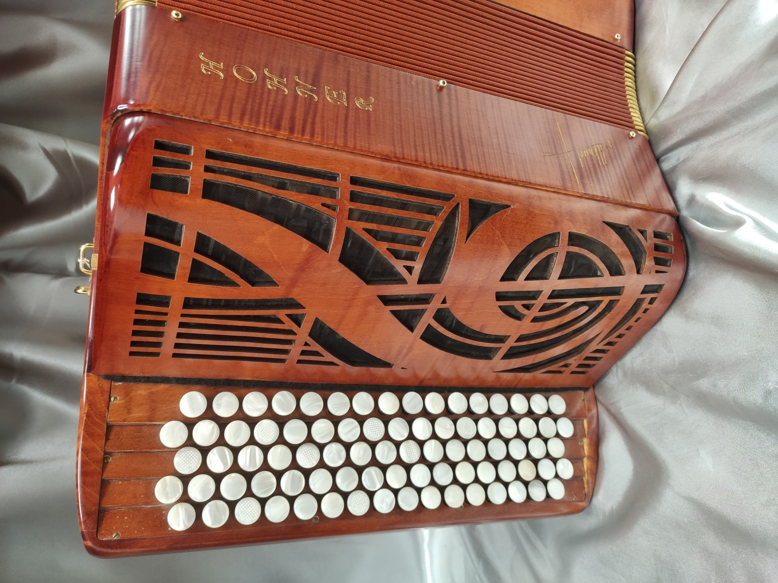 Modèle 4 voix double boite de résonance haut de gamme équipé des micros Limex intérieur au chant et aux basses. Equipé de musique A Mano HQ "Le Luthier" est Conçu en collaboration avec Mr Mornet (école Internationale CNIMA). Cet instrument de prestige (clavier à faible course, compact, double boite de résonance + extension du cassoto à l'intérieur du soufflet) est réalisé en bois de hêtre massif. Modèle 4 voix au chant avec double boite de résonance. A saisir !!