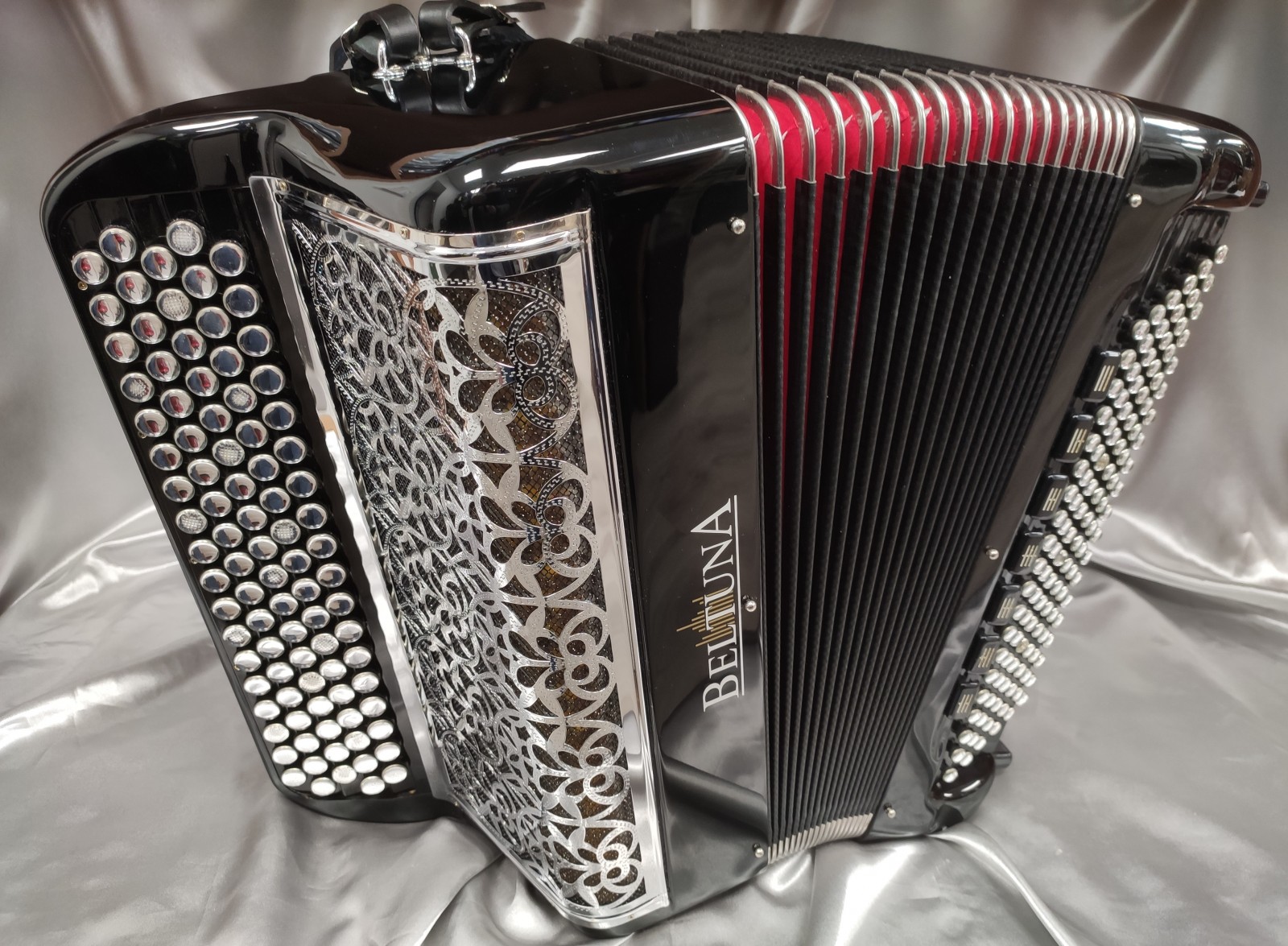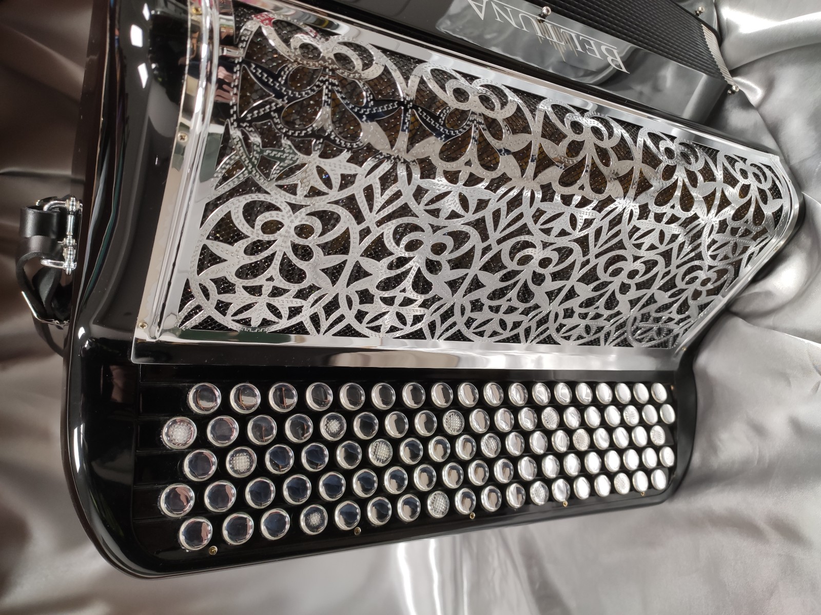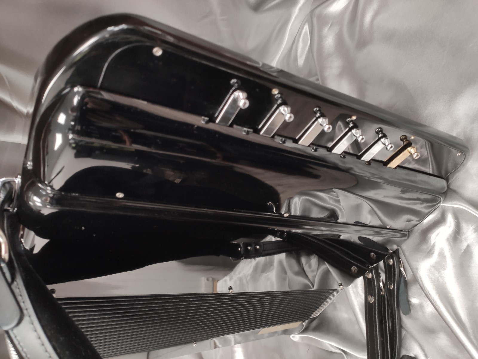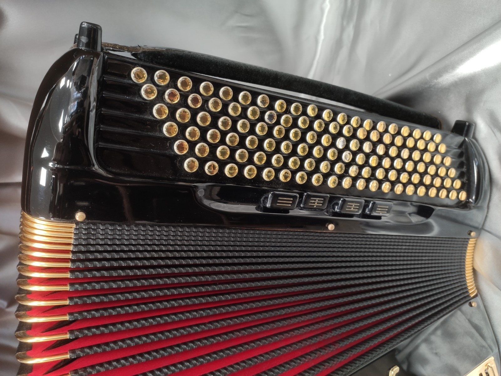 Main droite : 4 voix double boite de résonance, double basson en boite, Amplisound, 5 rangs, 56 notes, 92 boutons, 5 registres doubles