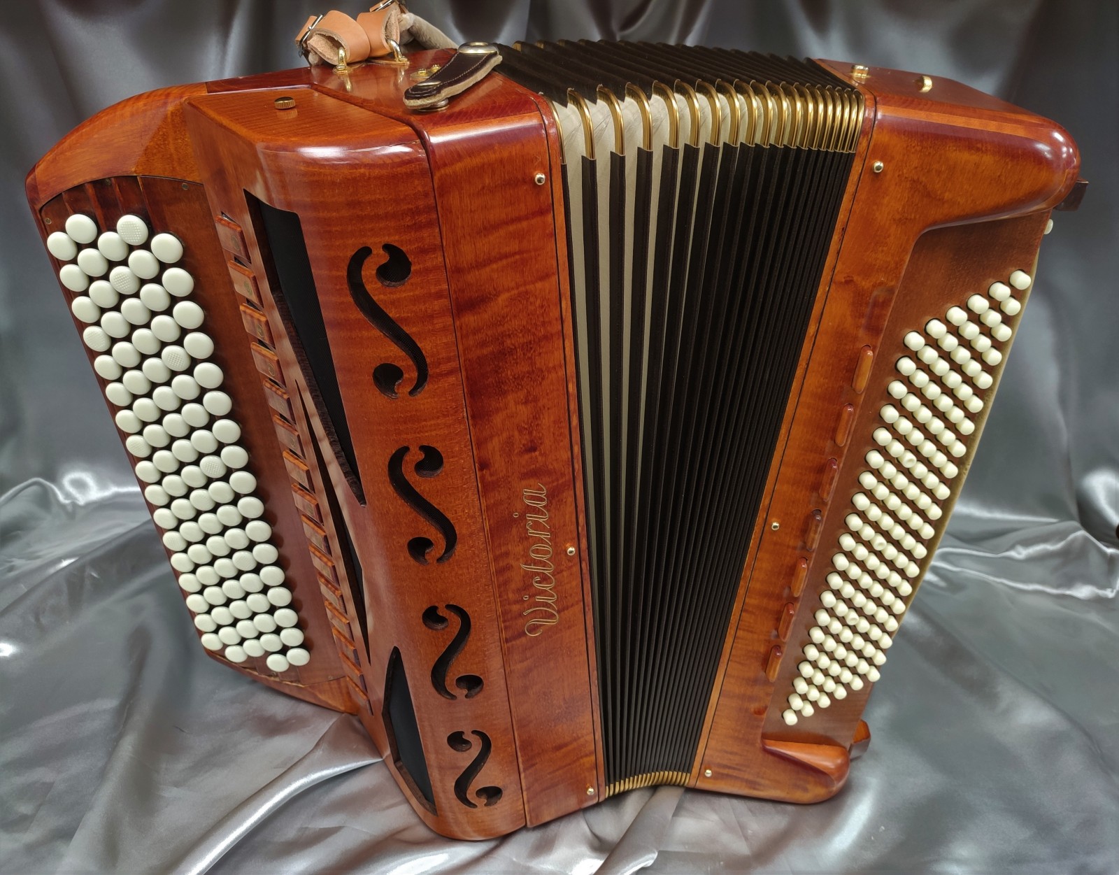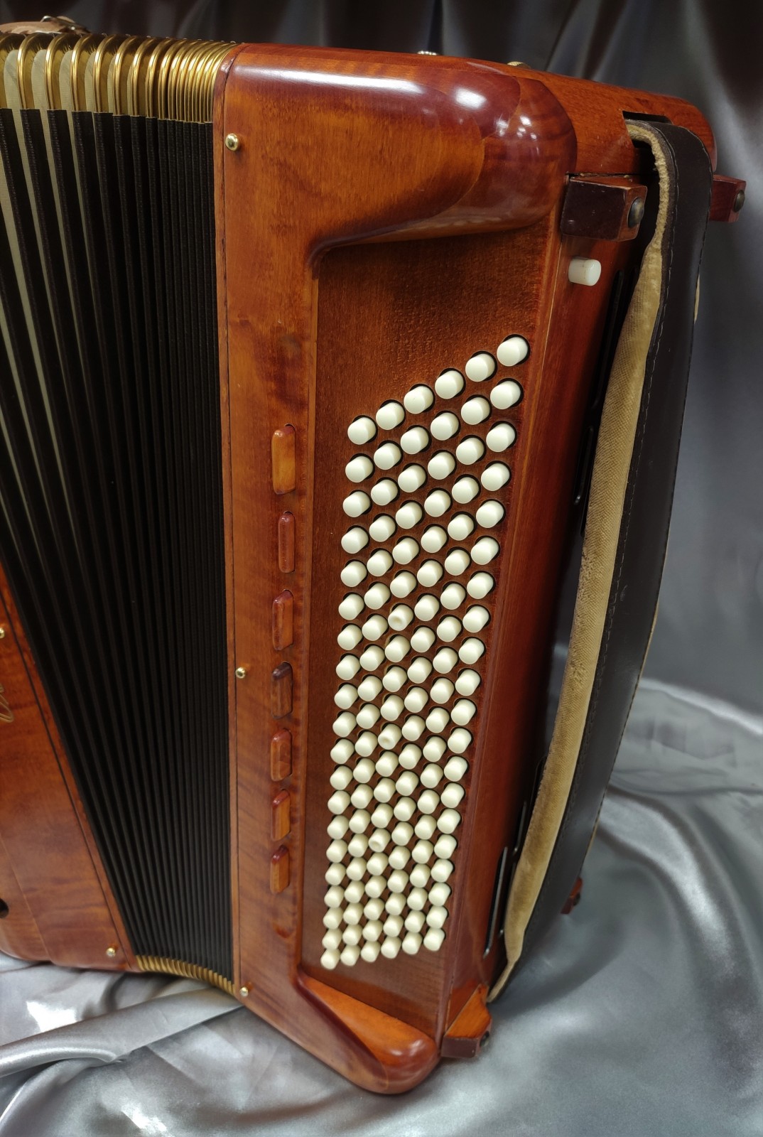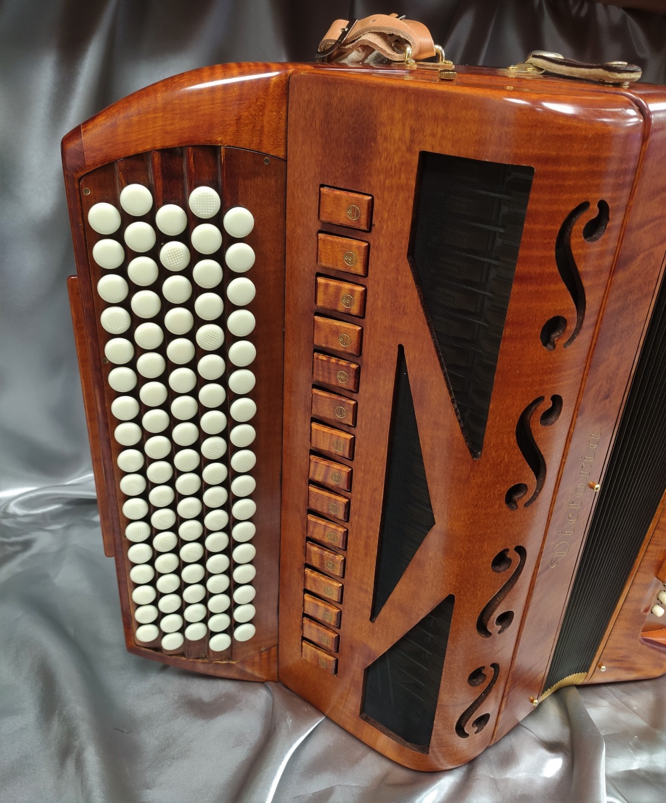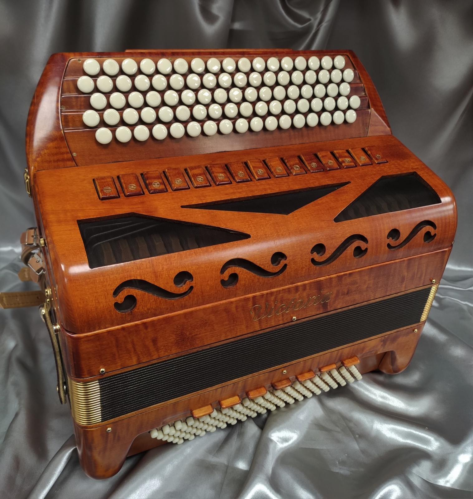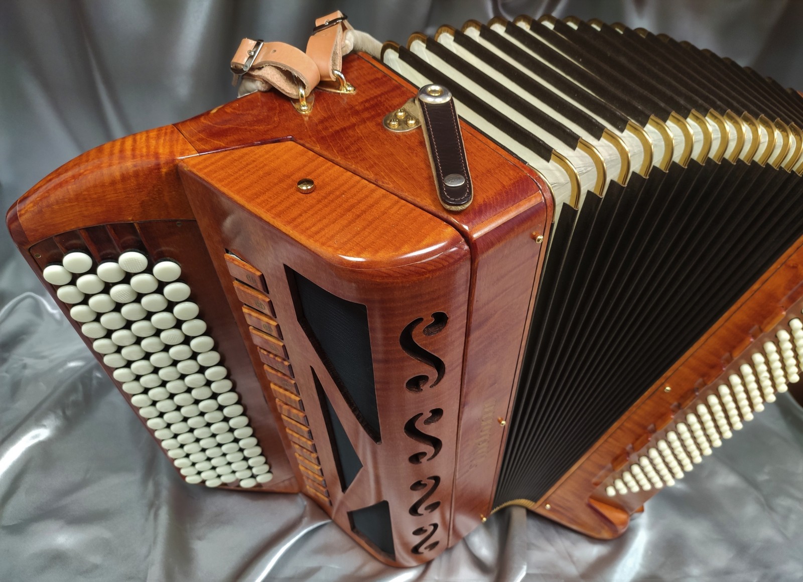 Modèle 4 voix double boite de résonance haut de gamme avec 5 rangées au chant et 120 basses. Modèle avec basson et flûte en boite de résonance, cet instrument de prestige en bois massif vous offre une diversité de sonorités complete avec 15 registres au chant.