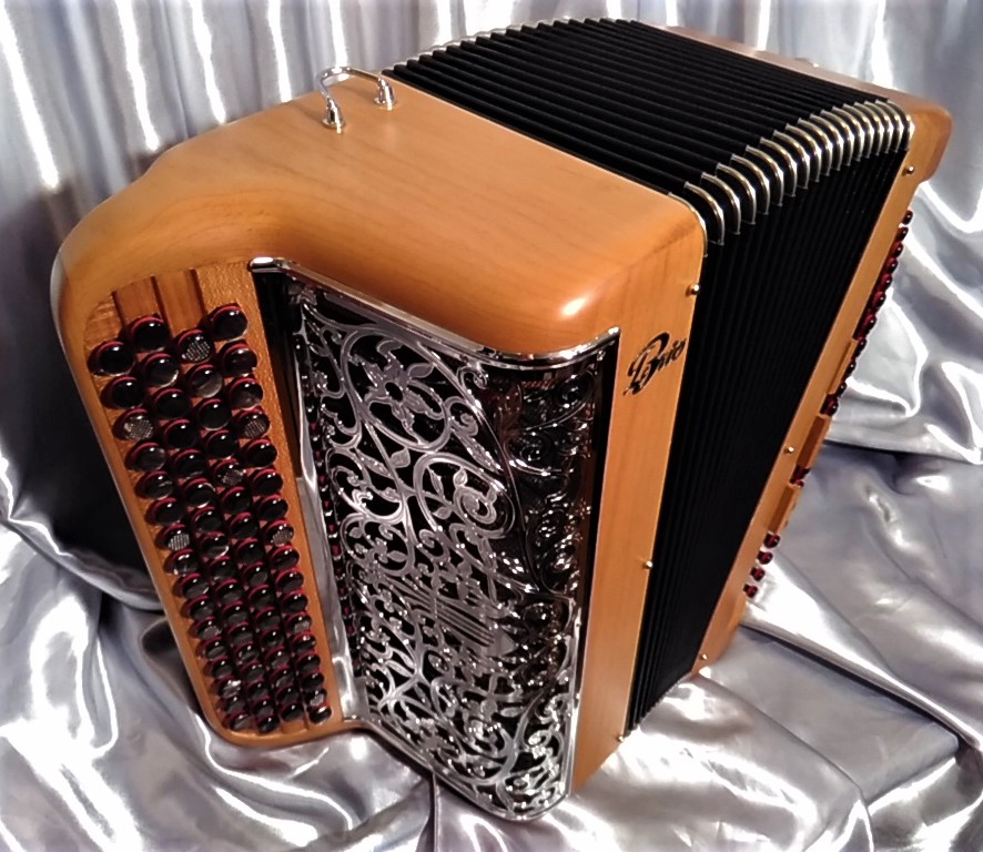 Mécanique 3/3 (3 rangées de basses et 3 rangées d'accords) ou 2/4 (2 rangées de basses et 4 rangées d'accords) au choix à la commande.- Finitions : Ce modèle est en bois massif, un grand choix de coloris s'offre a vous : finition bois ou peinture, unie, dégradée, pailletée ou non... après le confort de jeu, le plaisir des yeux...