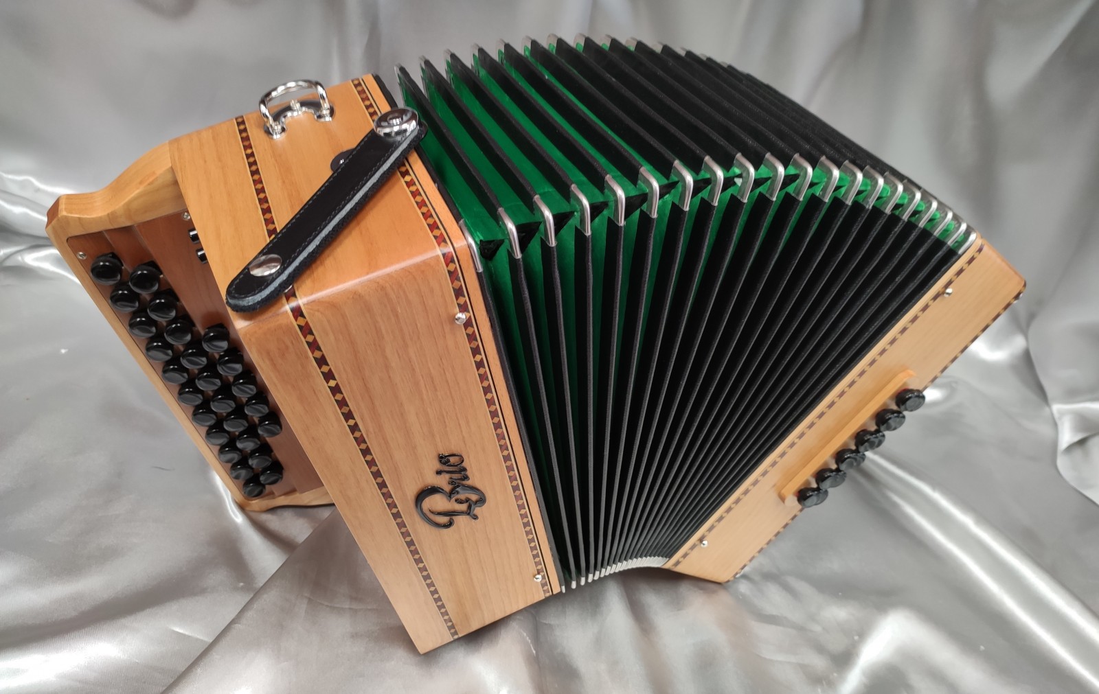 ♫ "Le Brio 2 rangs 1/2 (21 touches + 5 alt) à 3 voix, 12 basses", possède 3 voix au chant avec 3 registres sur la grille permettant les 5 sonorités différentes (2 voix médium, bandonéon, 3 voix plein jeu, Basson, flûte), ainsi qu'un registre main gauche permettant la suppression des tierces.