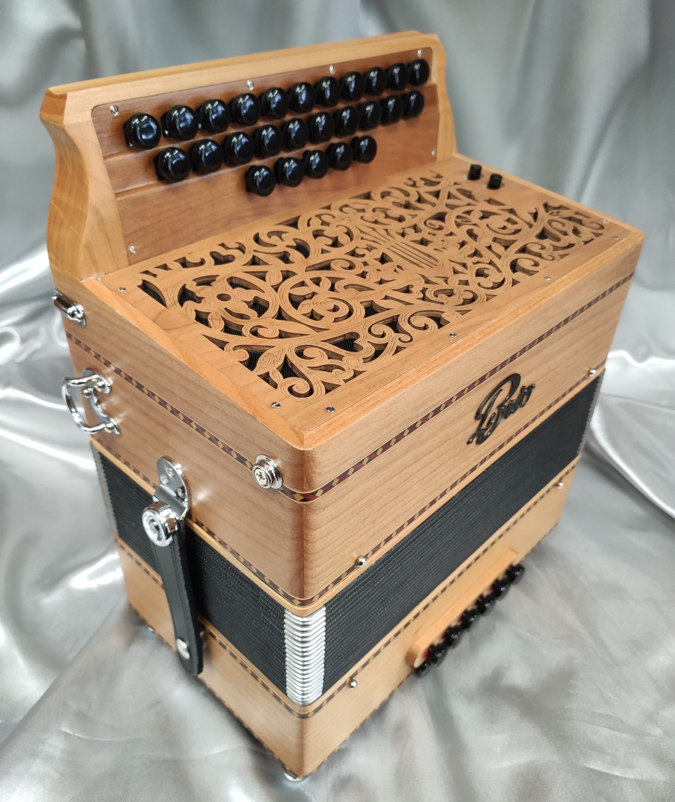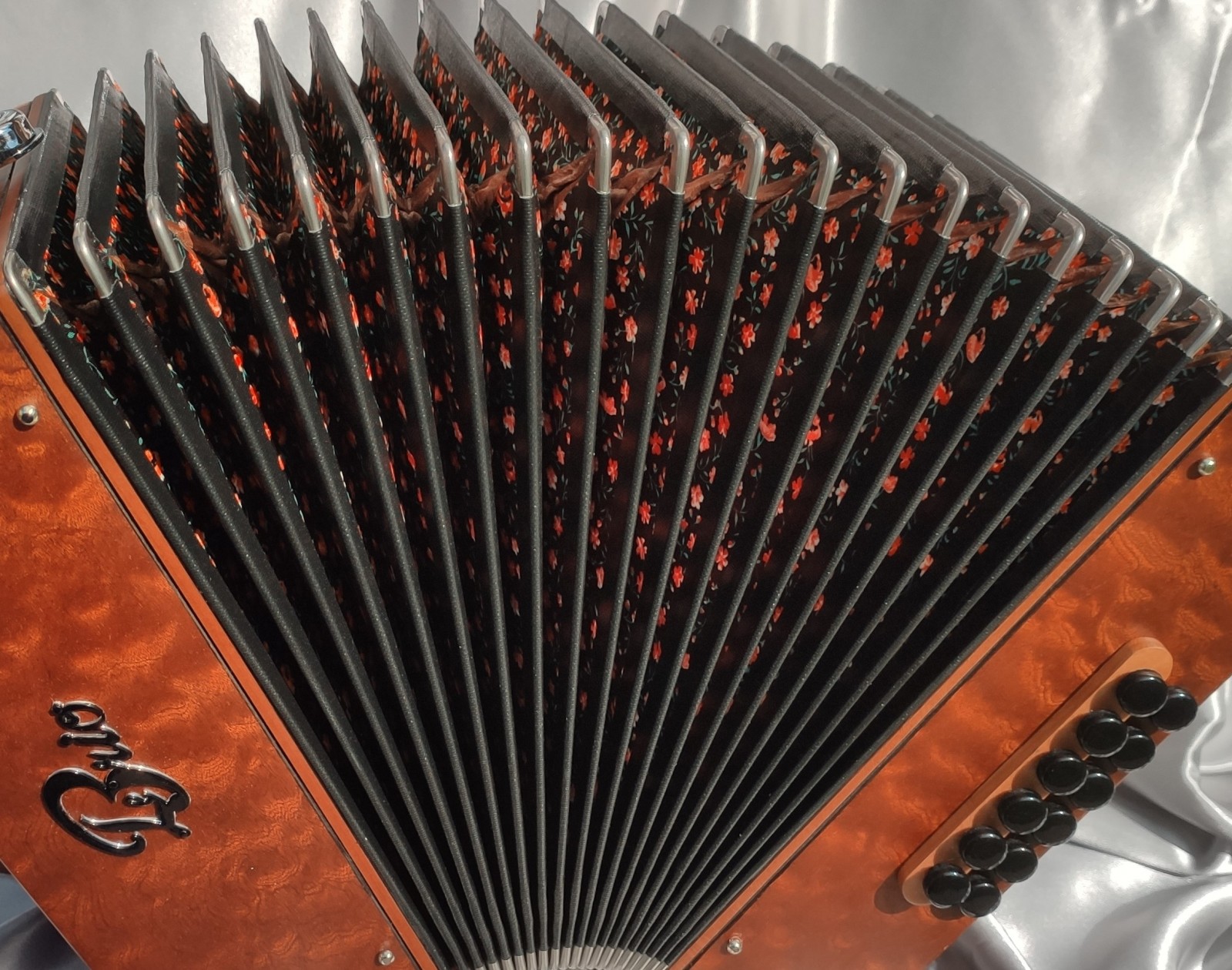 ♫ "Le Brio 2 rangs 1⁄2 (21 touches +5 alt) à 2 voix Bando (8-16), 12 basses", possède un registre de suppression de tierce et 2 registres au chant situé sur la grille permettant 3 sonorités : Flûte, Basson, et 2 voix bandonéon (2 voix à l'octave). La musique SD, TAM ou A mano peuvent être installées sur ce modèle haut de gamme.