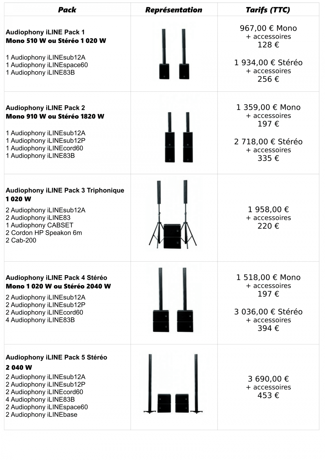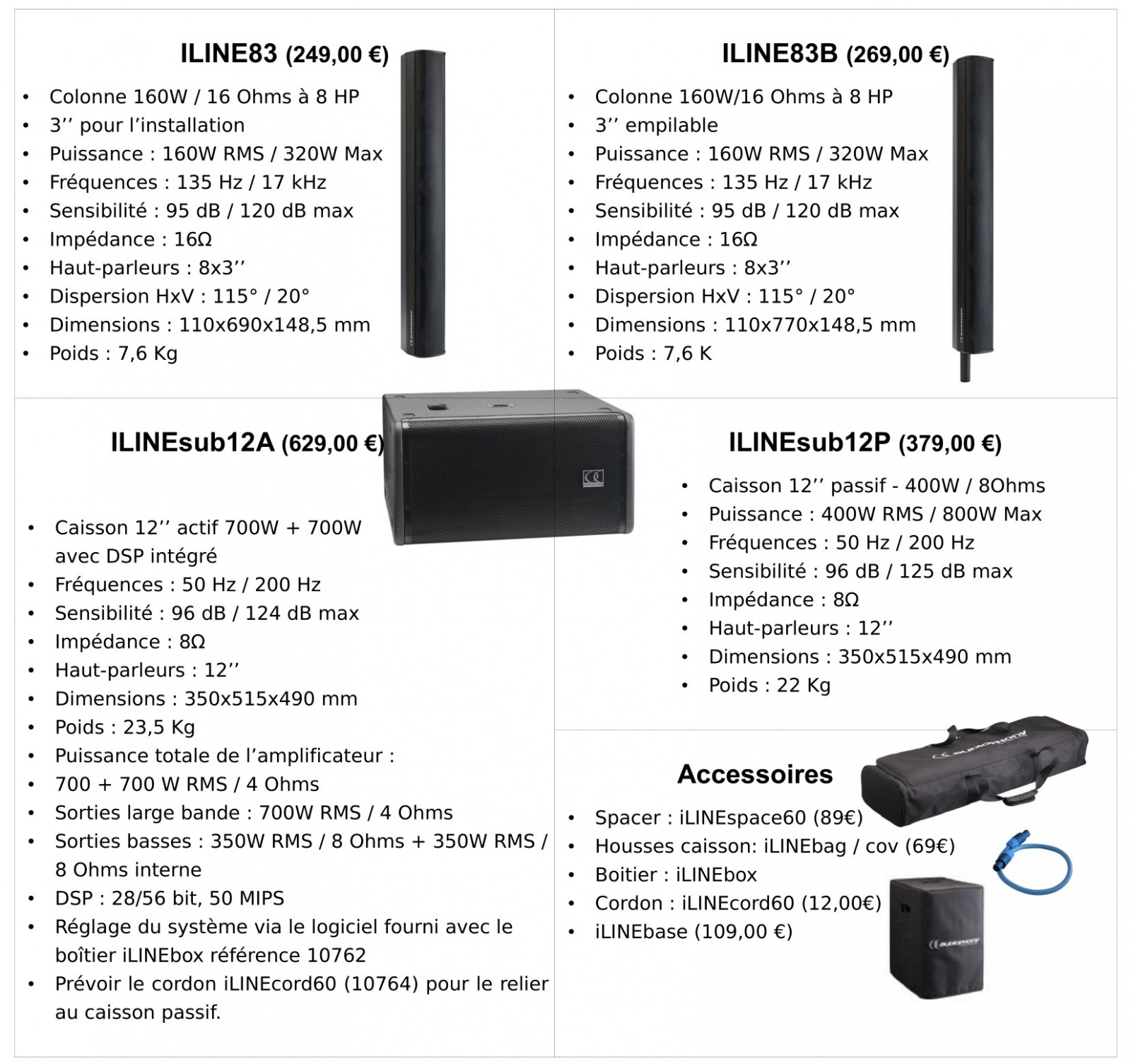 Par exemple : Sytéme Mono avec 1 caisson et une colonne pour 510 Watt, ou un systéme stéréo avec 2 cassons et 2 colonnes pour 1020 Watt. Un système Mono renforcé d'un Caisson iLINEsub 12P ou d'une colonne iLine83B, idem pour le système stéréo...etc