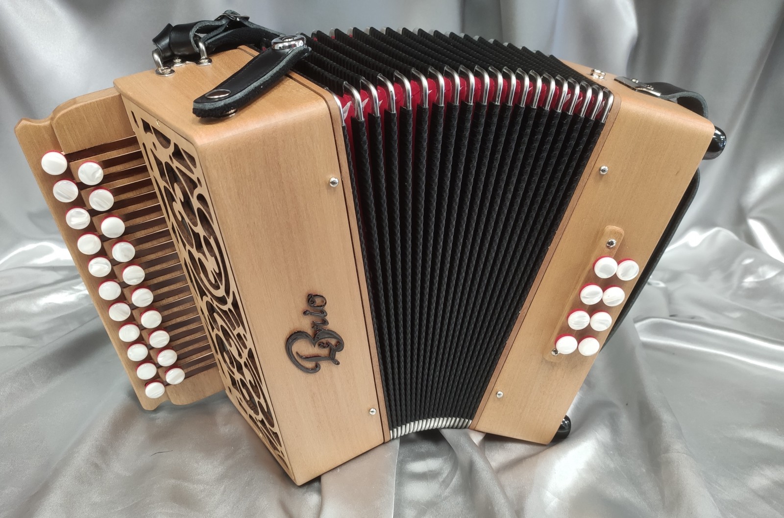 Ses dimensions de 26cm en position de jeu et 15cm de largeur pour 3 kg seulement , font de lui un petit diatonique idéal pour débuter et jouer avec un accordéon compact, léger et en bois massif !
