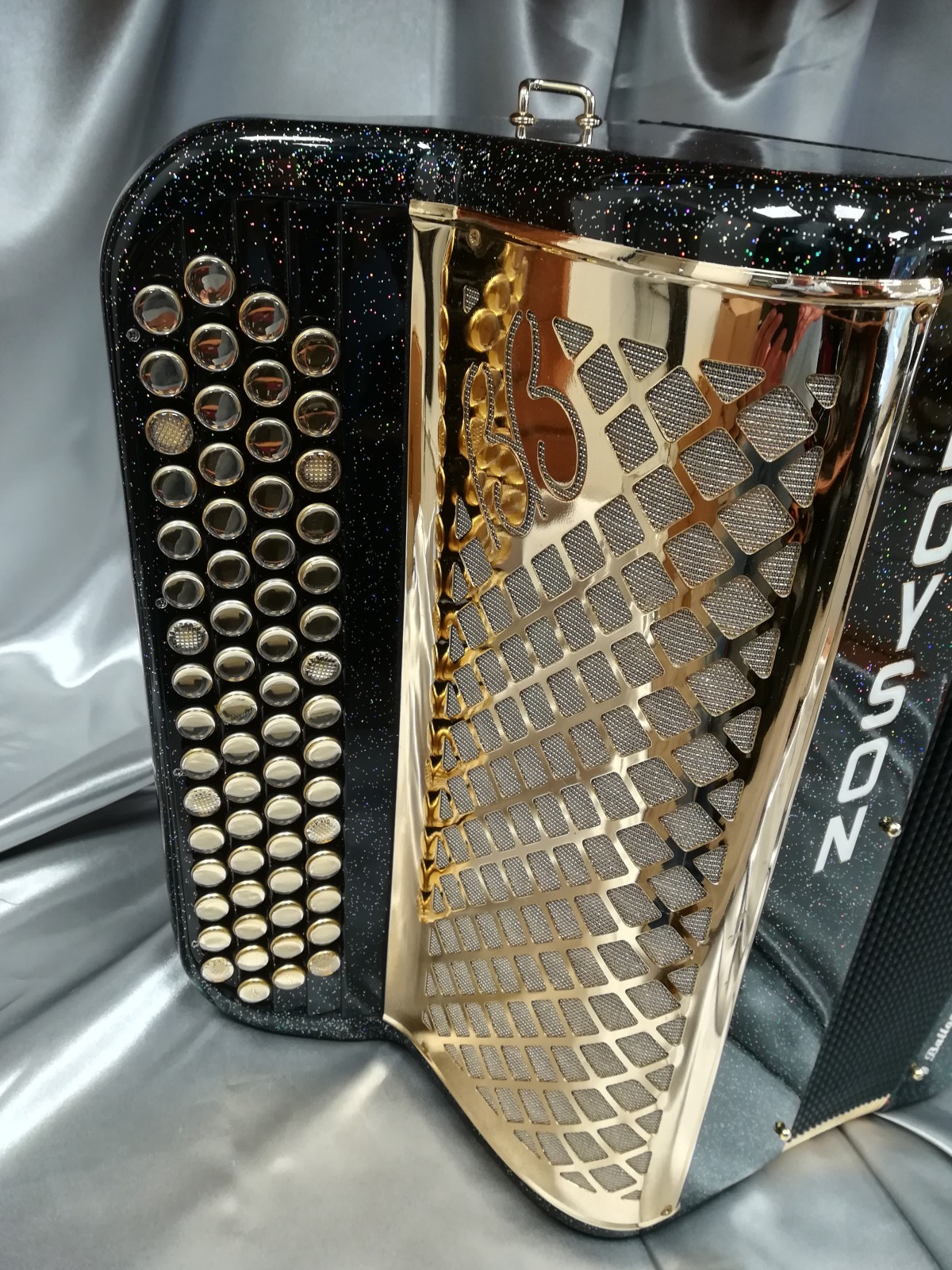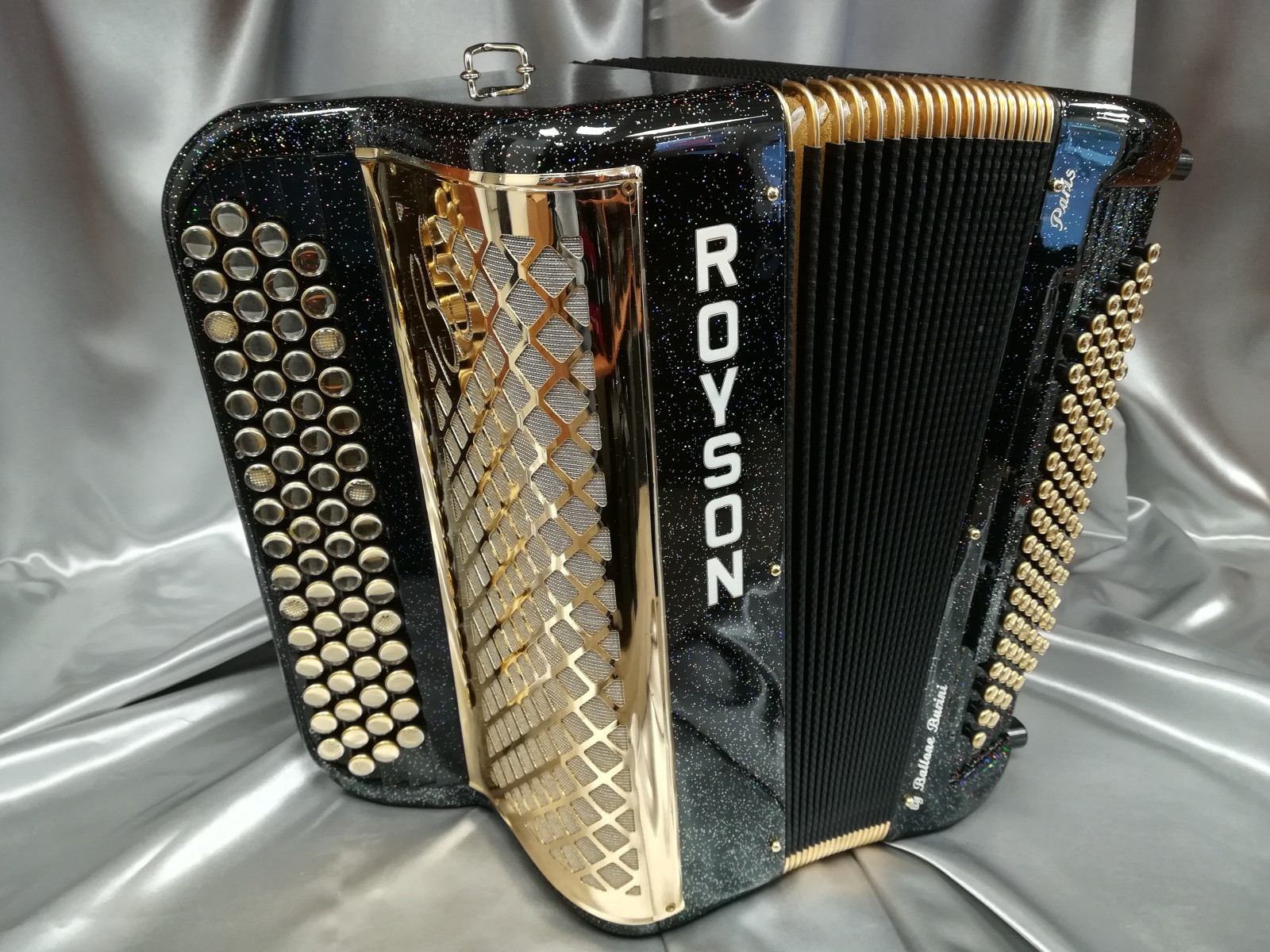Modèle 3 voix musette noir pailleté avec option or, boutons miroirs à saisir. Modèle équipé Midi Limex neuf avec registres de coupure acoustique.