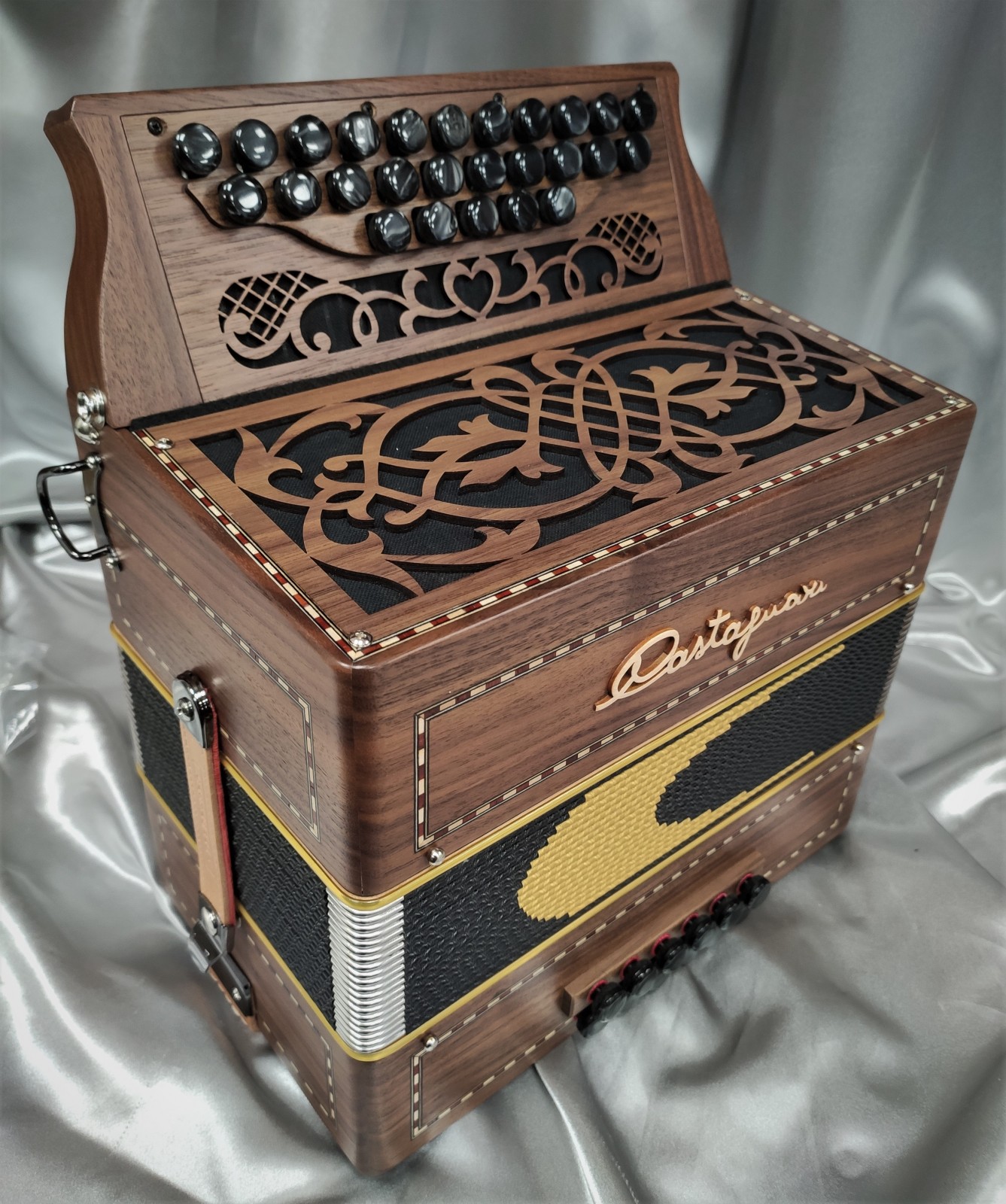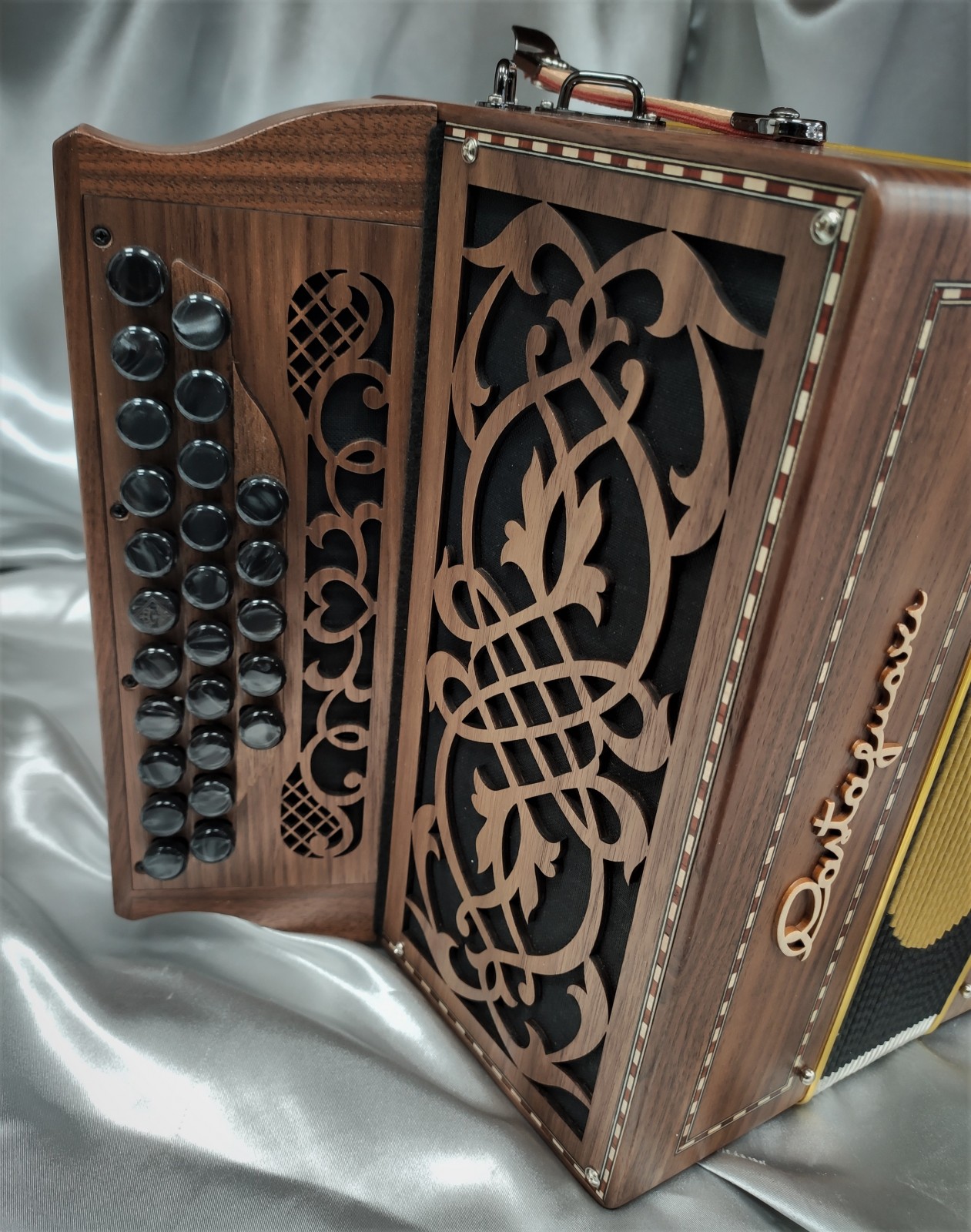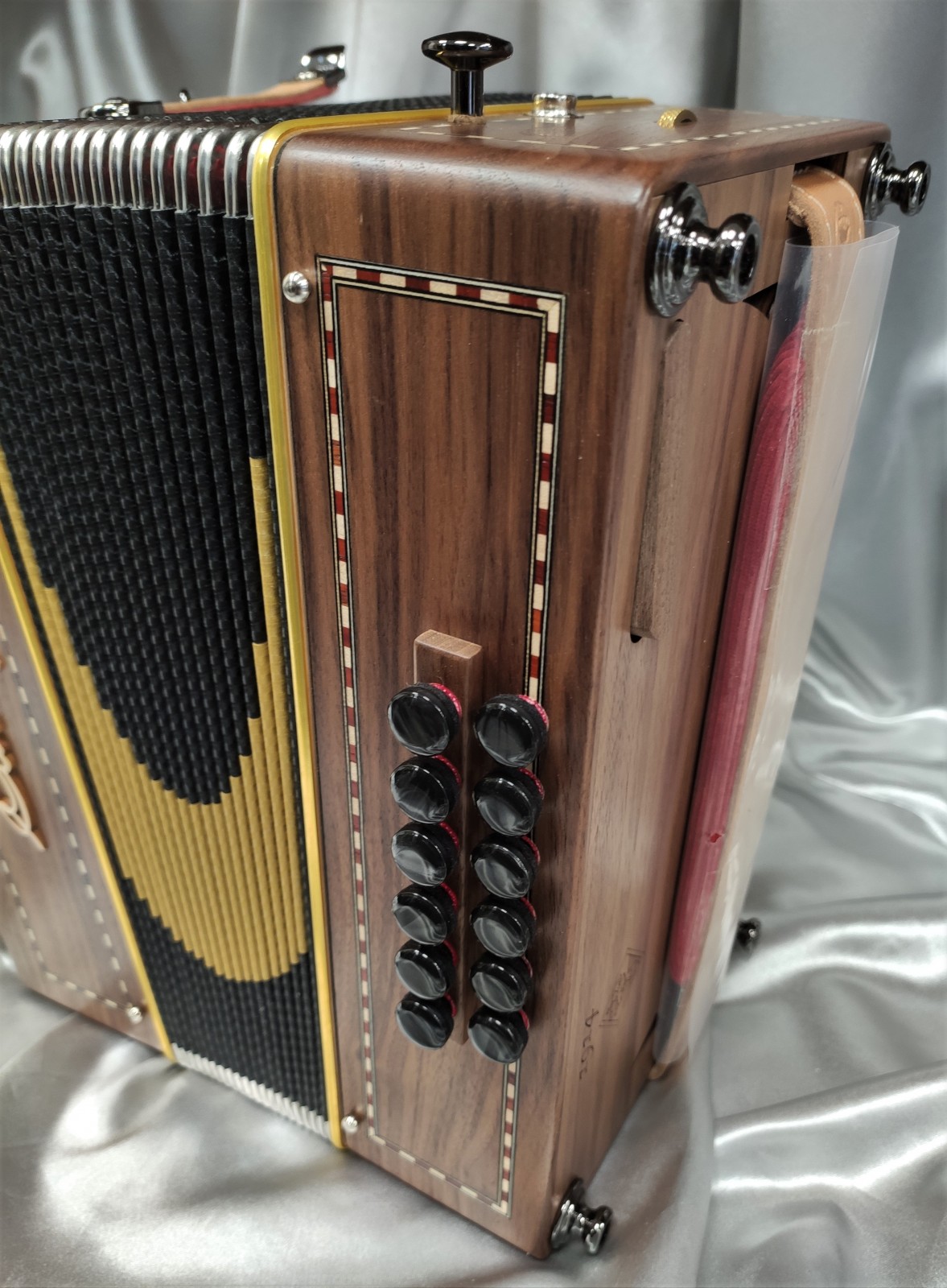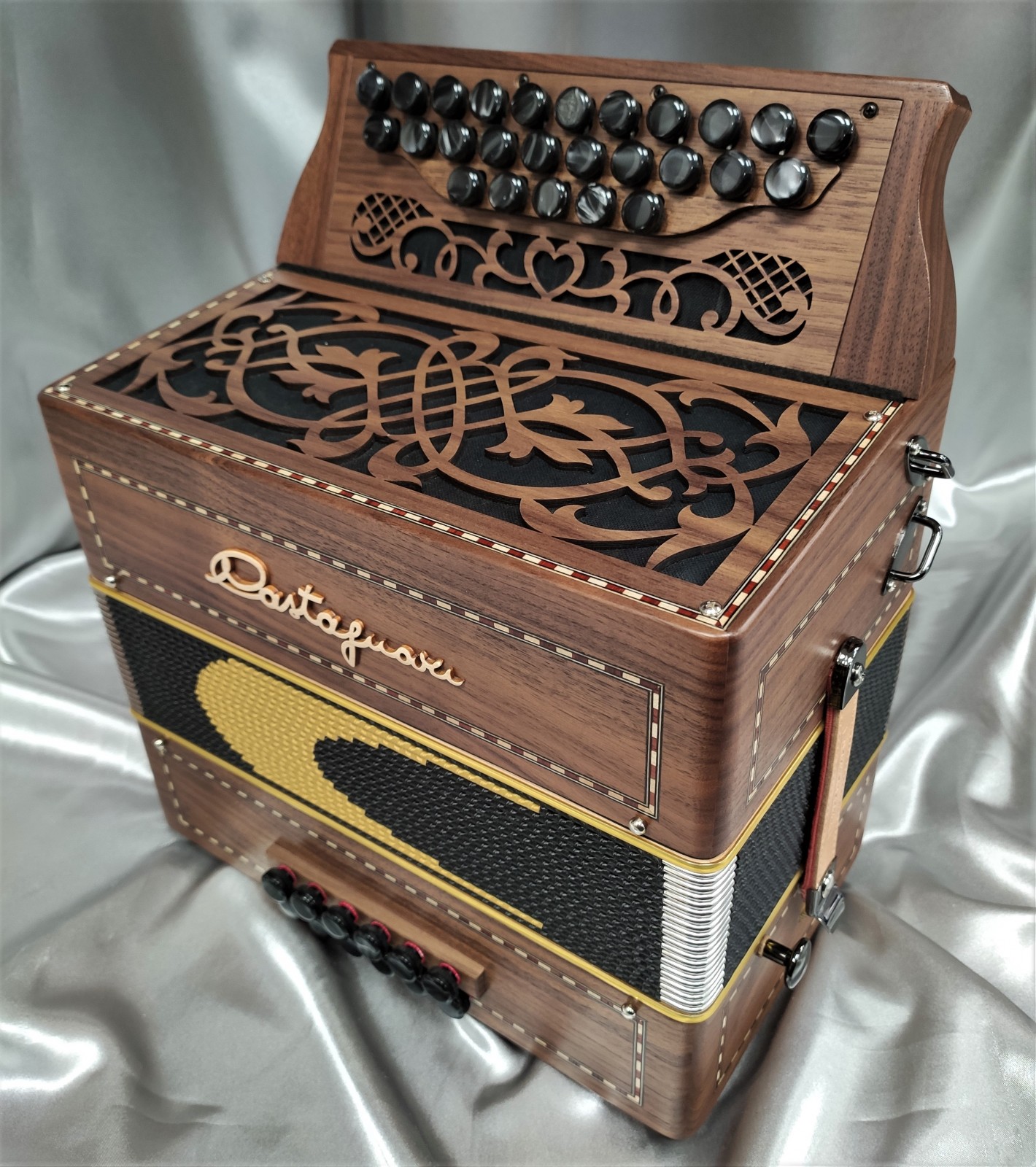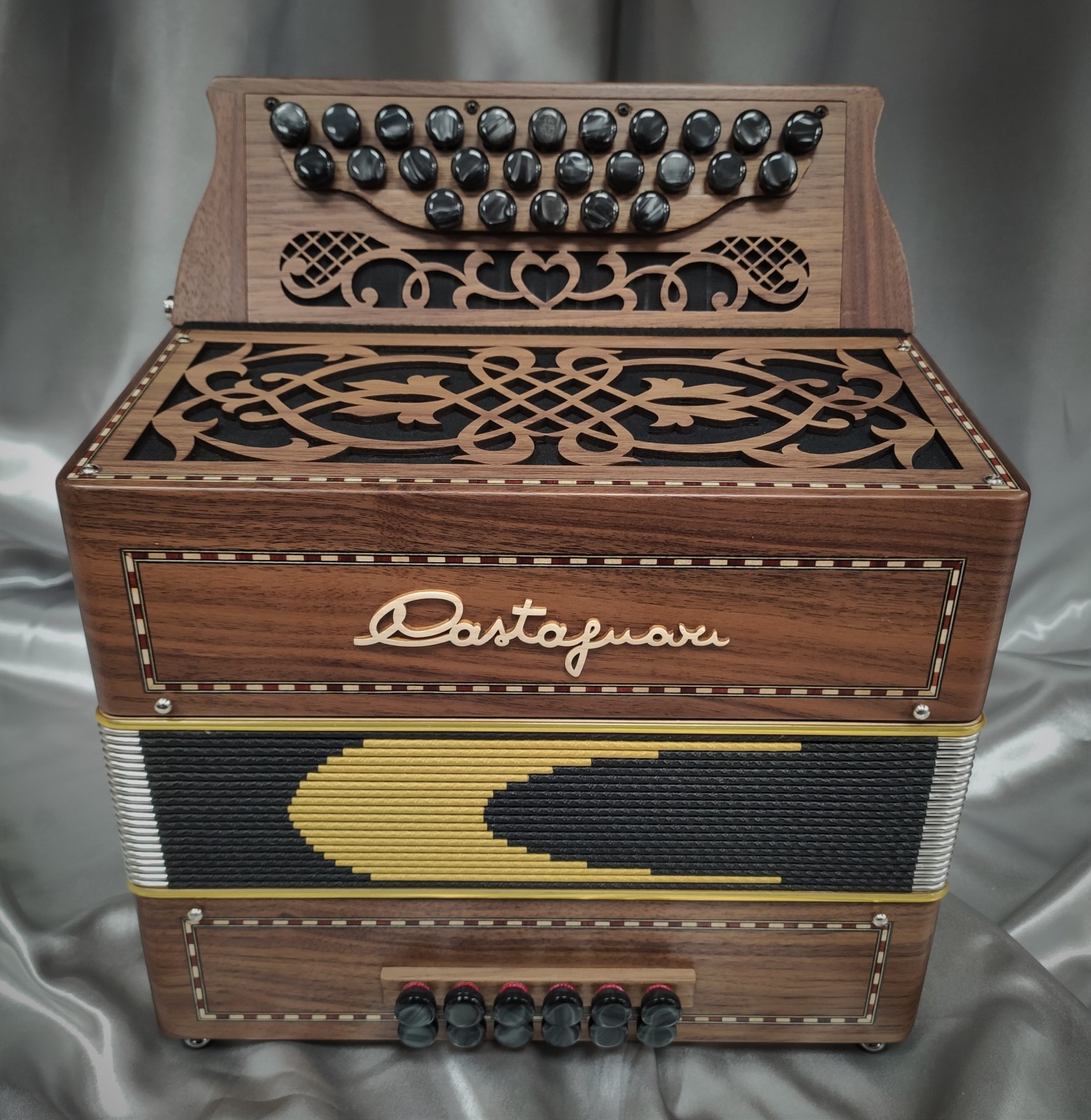 Le Dony est un modèle en bois massif (Noyer ou cerisier) avec 2 rangs 1/2 à 2 voix au chant. 12 basses avec en option, le registres suppression des tierces par tirette.