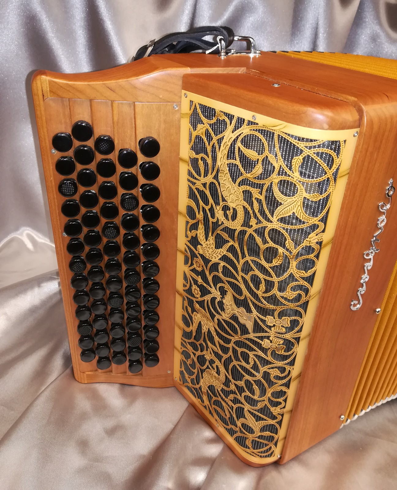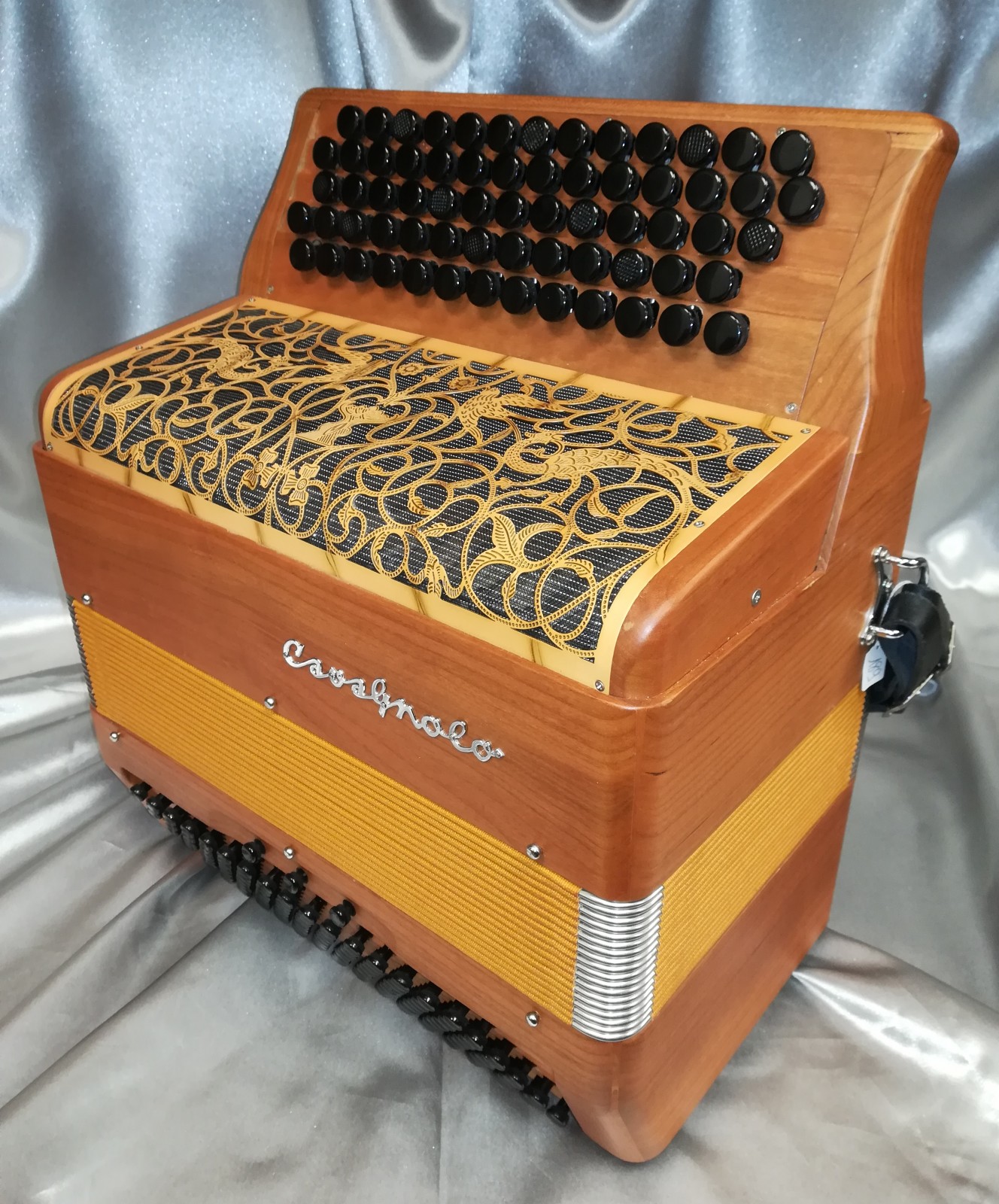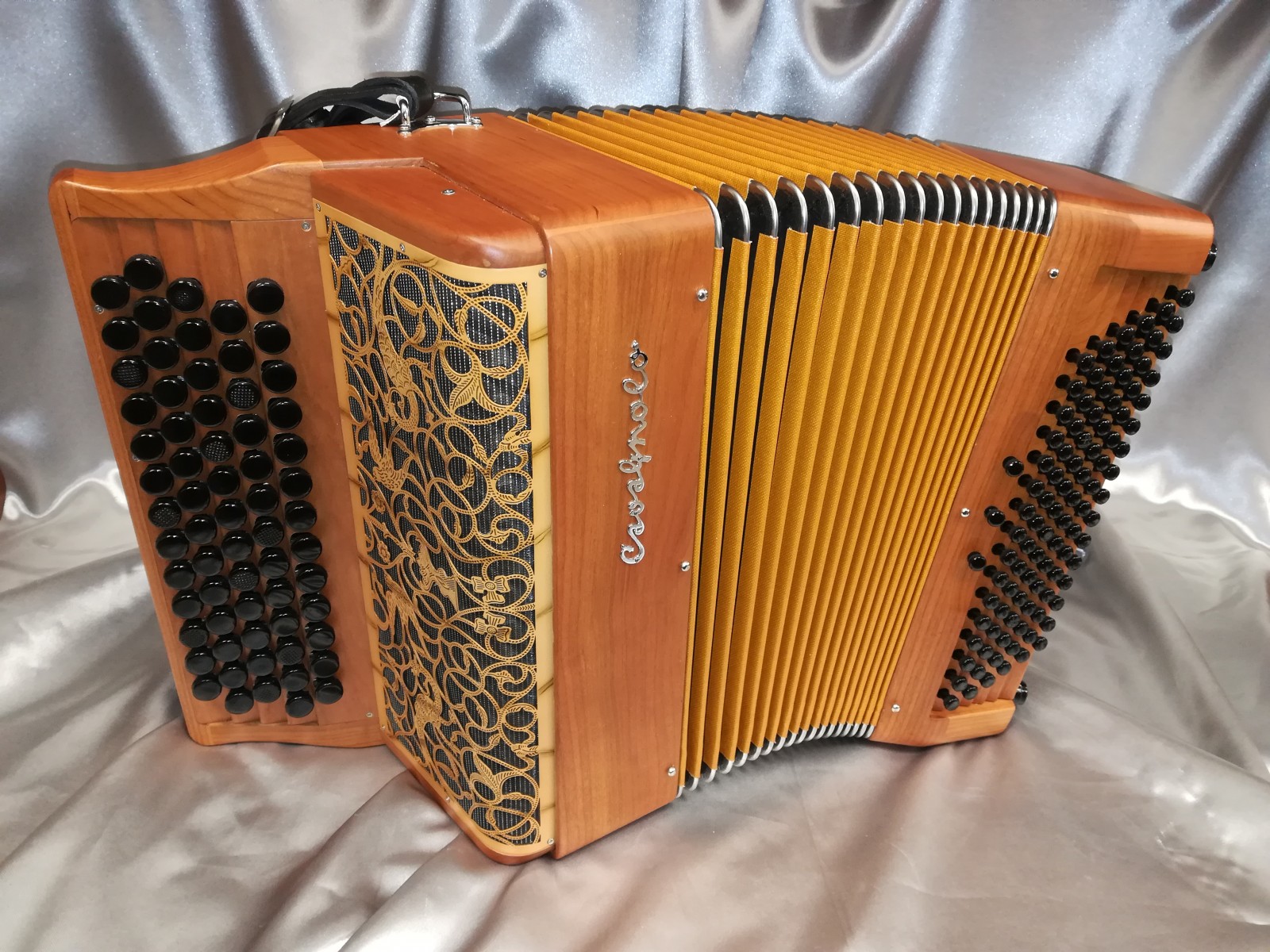 Modèle bois 3 voix. 5 rangées au chant, 96 basse. Etendue au chant de 40 notes (Du Mi au Sol). Modèle avec musique TAM. Fabrication italienne de bonne facture. A saisir !!