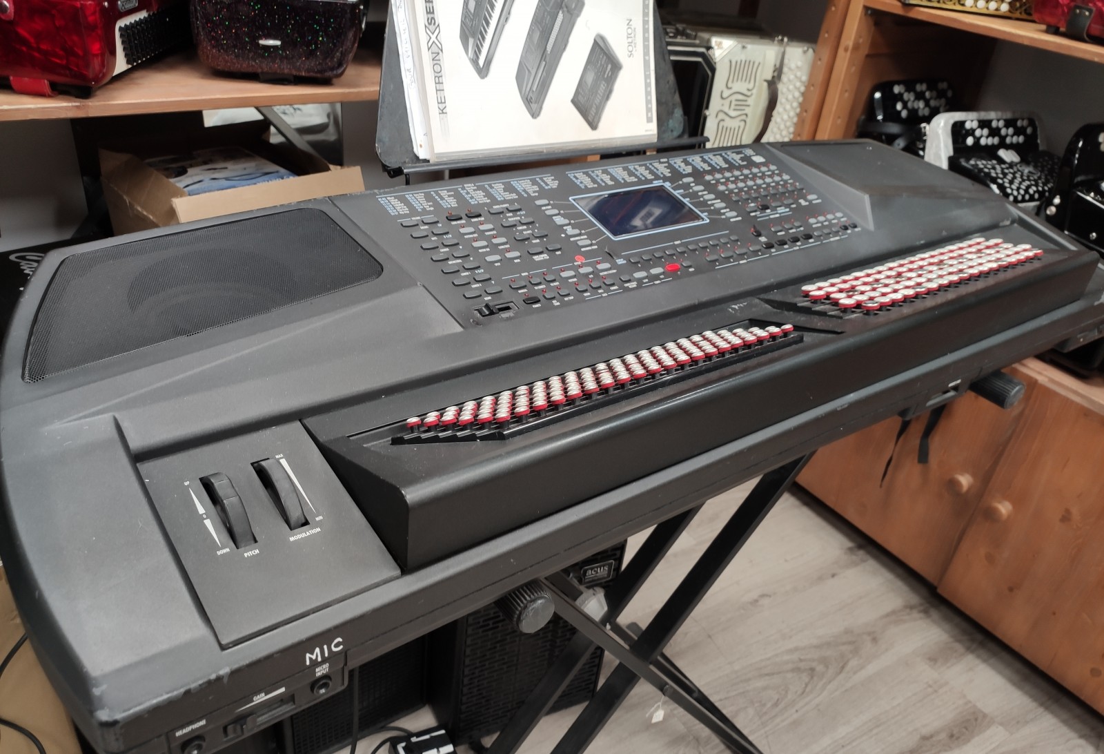 Clavier arrangeur X8 ketron d'occasion, état moyen avec des traces d'usures mais fonctionne parfaitement. Ce clavier Ketron arrangeur est idéal pour tester votre intérêt à ce genre de clavier. Il est disponible avec son pupitre et sa notice d'utilisation en français et le pied. A saisir !!