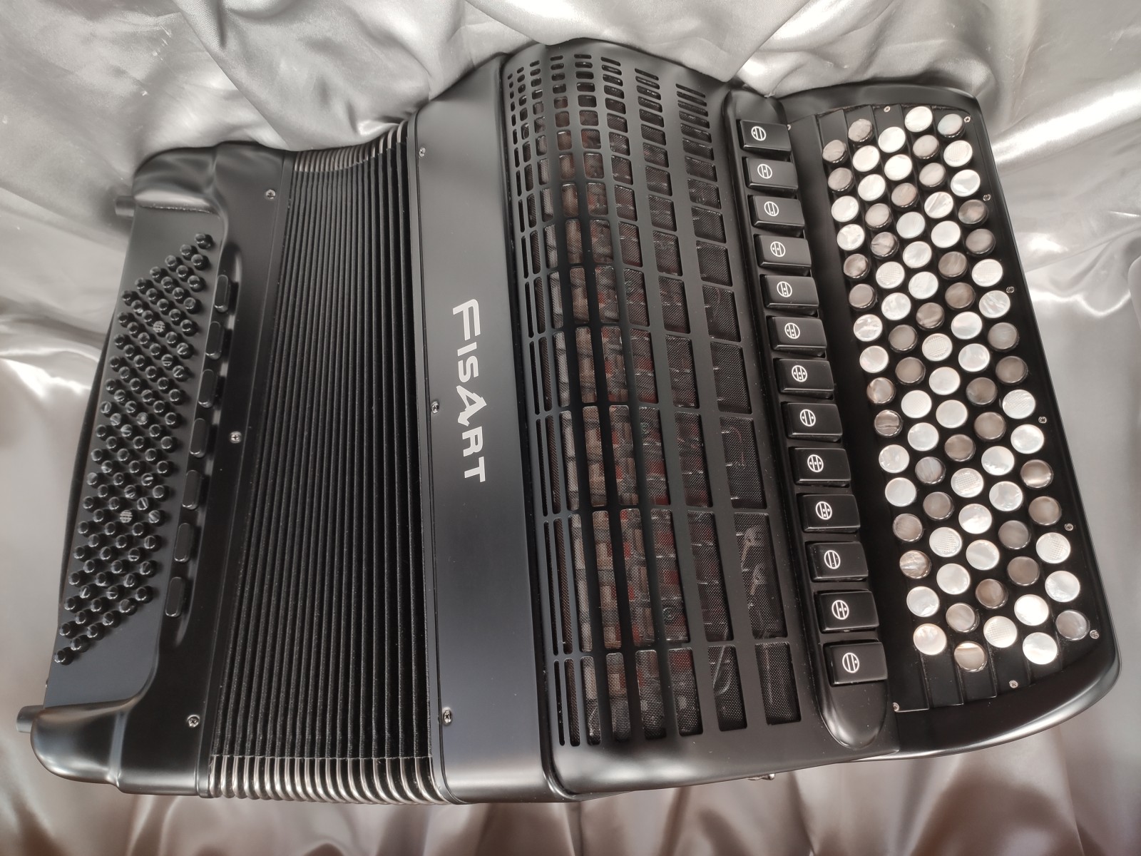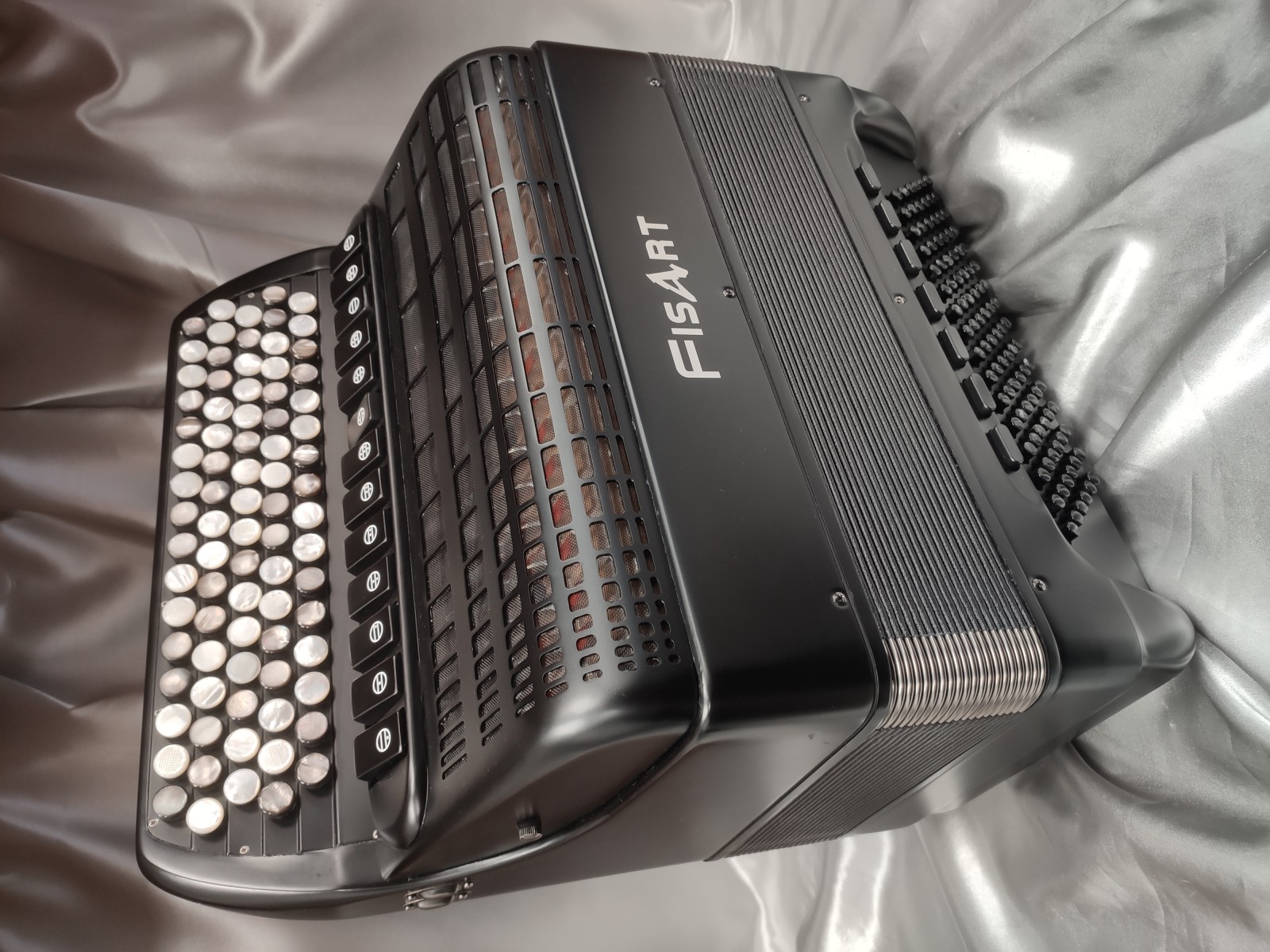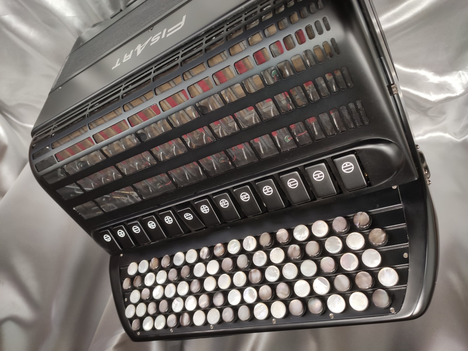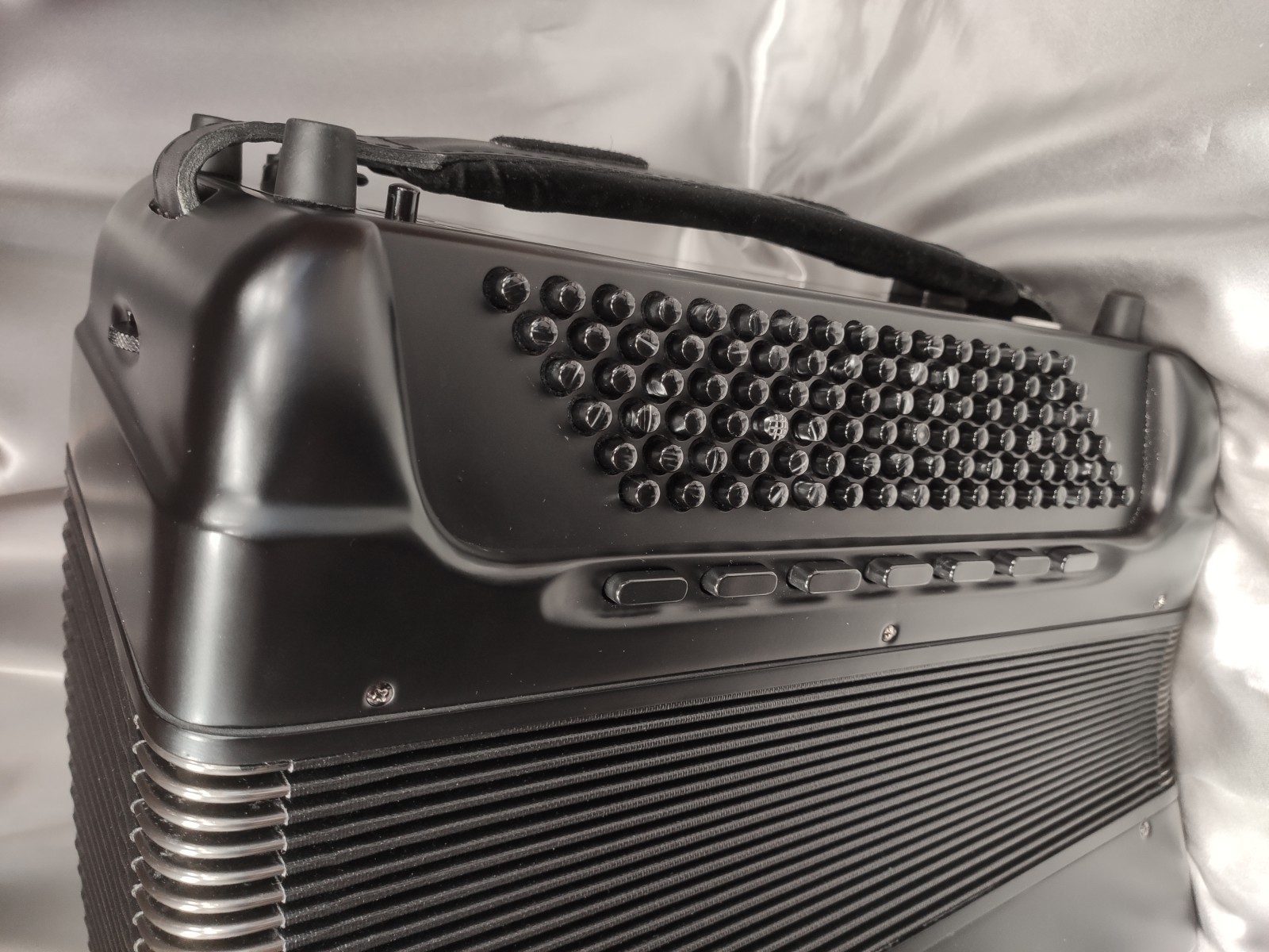 50 notes réelles (82 boutons) pour 5 rangs, étendue Ré#/Mi, qualité des voix : A Mano