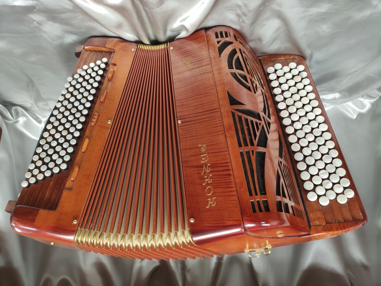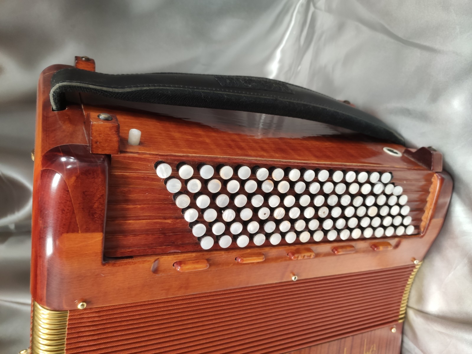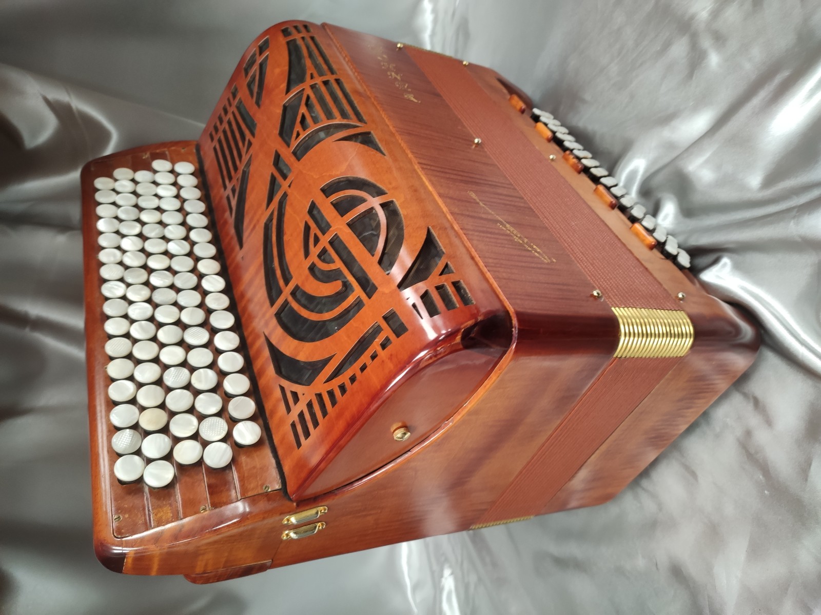 Modèle 4 voix double boite de résonance haut de gamme équipé des micros Limex intérieur au chant et aux basses. Equipé de musique A Mano HQ "Le Luthier" est Conçu en collaboration avec Mr Mornet (école Internationale CNIMA). Cet instrument de prestige (clavier à faible course, compact, double boite de résonance + extension du cassoto à l'intérieur du soufflet) est réalisé en bois de hêtre massif. Modèle 4 voix au chant avec double boite de résonance. A saisir !!