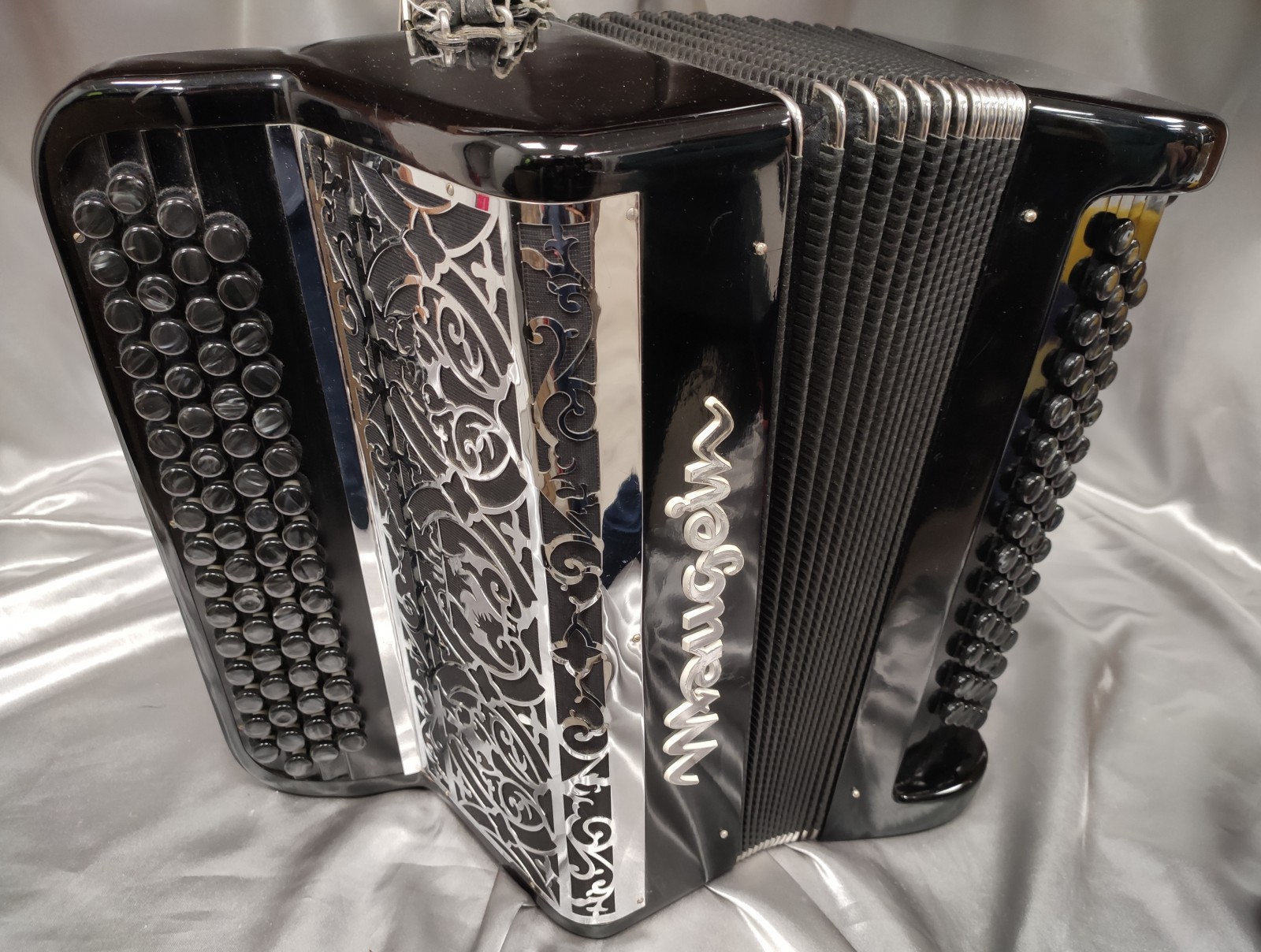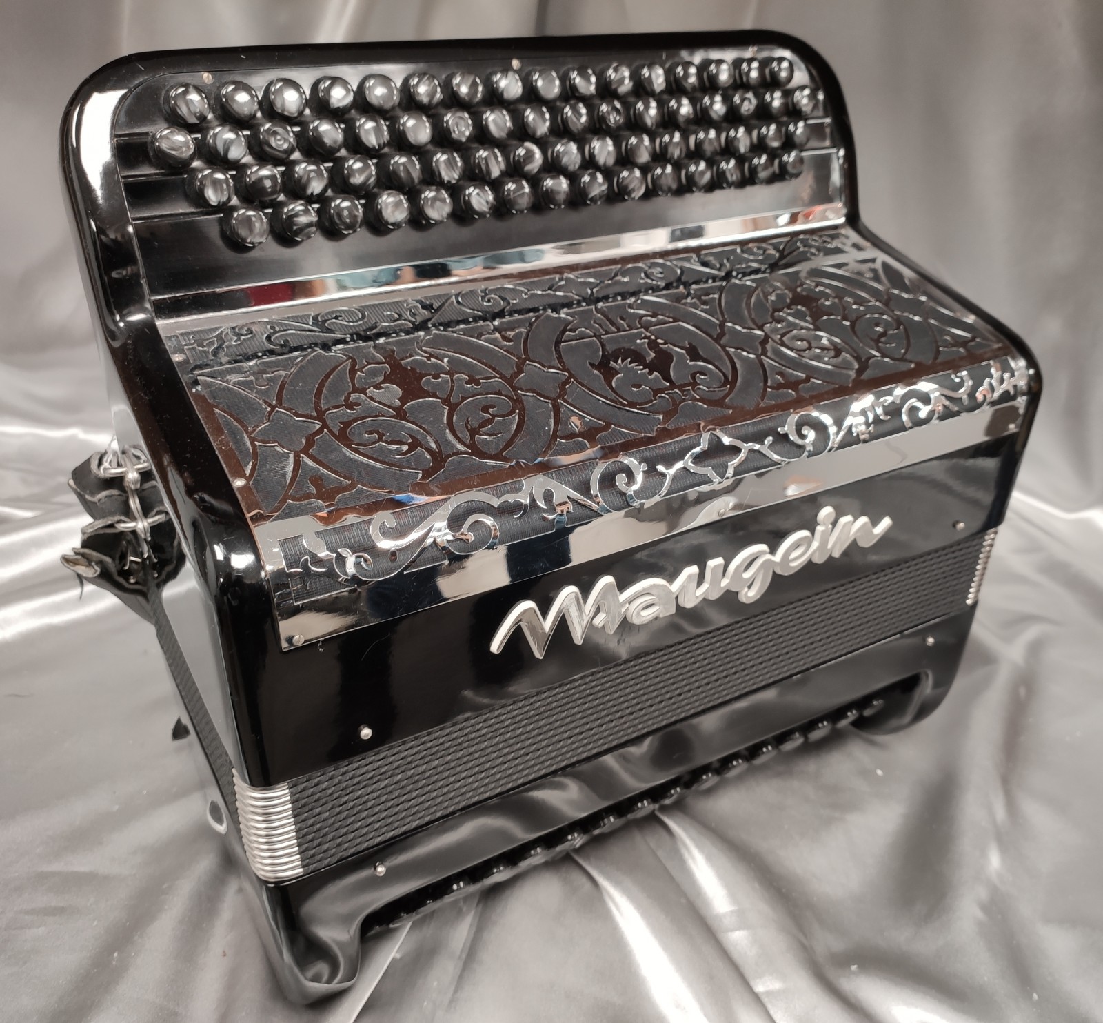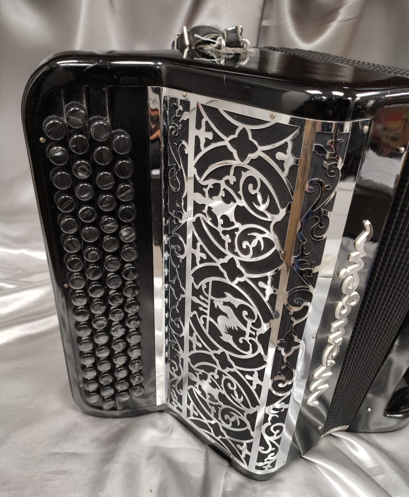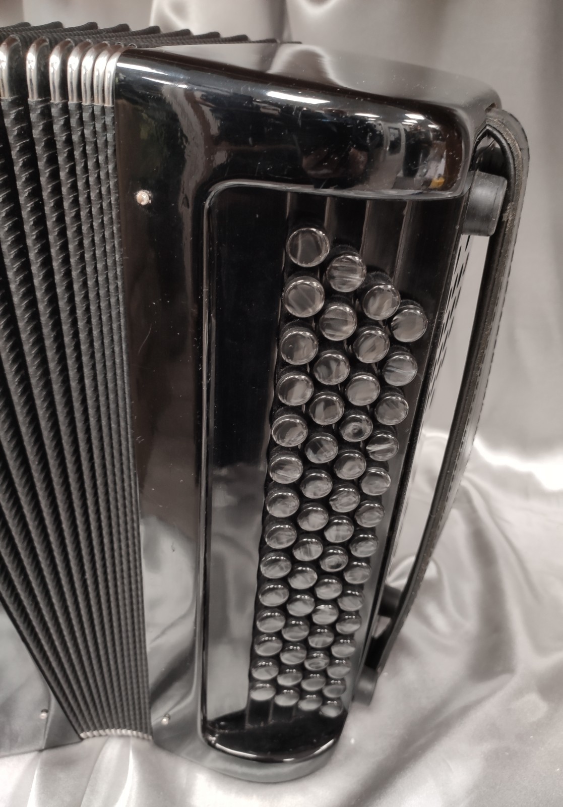 Modèle basses chromatiques. L'Harmonéon reste un instrument atypique, uniquement en basses chromatiques, donc pas de déclencheur. claviers boutons identique aux deux mains. Clavier main gauche avec les notes graves en bas.