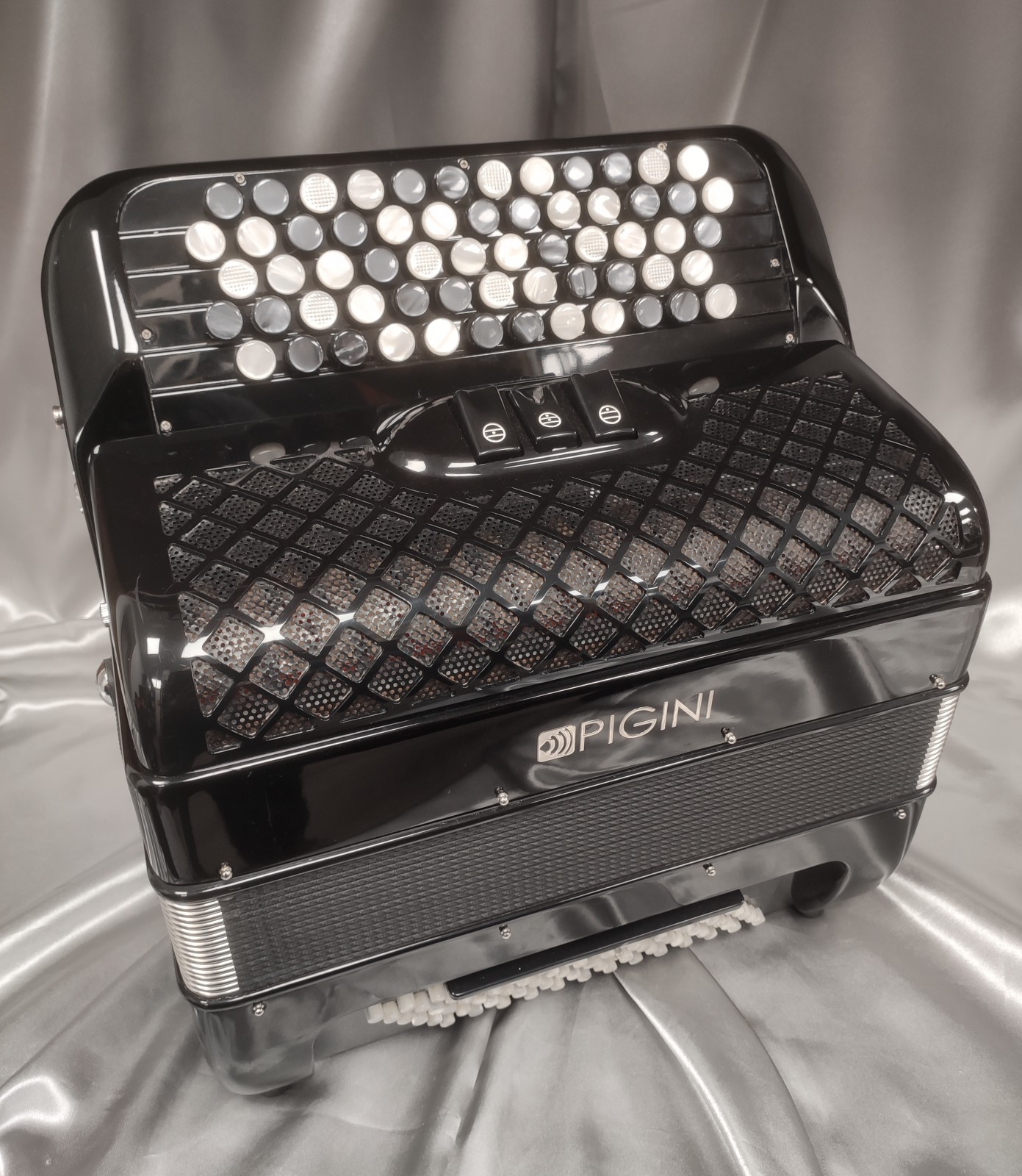 Modèle Pigini Concertino 1, à 2 voix au chant avec 78 basses standard/basses chromatique. Idéal pour l'étude des basses chromatiques avec une étandue et un format idéal à l'étude. Disponible à la vente ou la location.