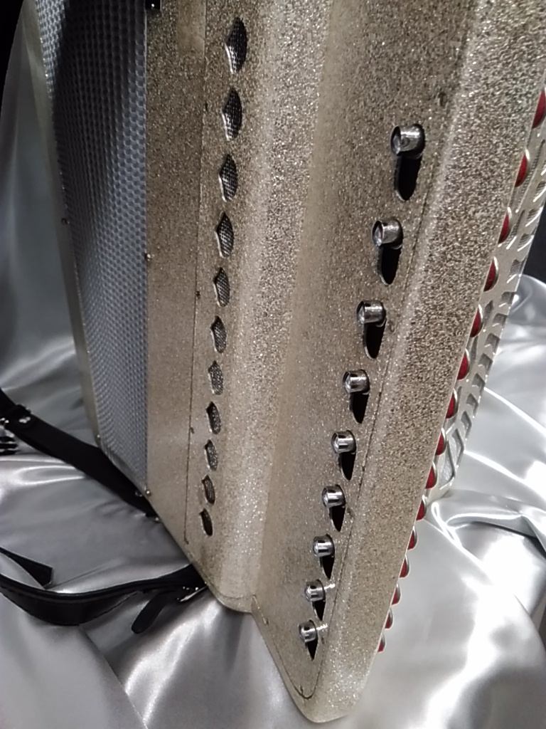 Main droite : 4 voix avec 3 voix musette et Basson, 4 rangs pour 52 notes, 9 registres.