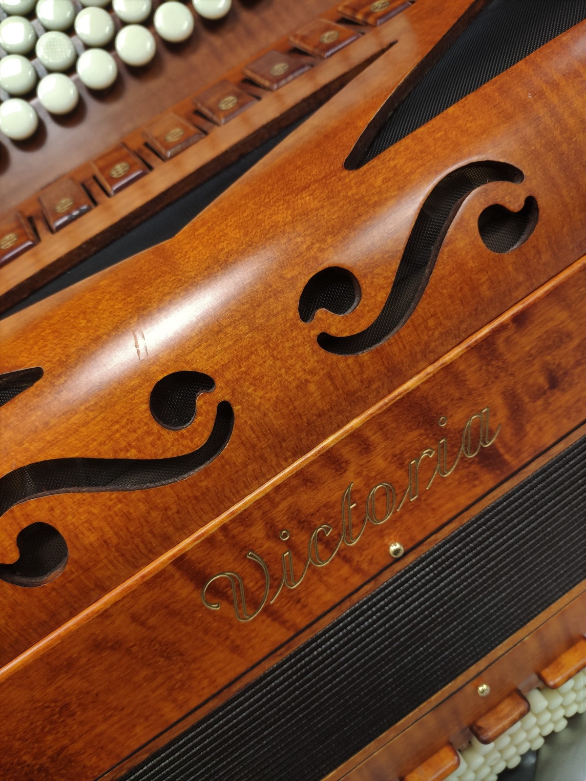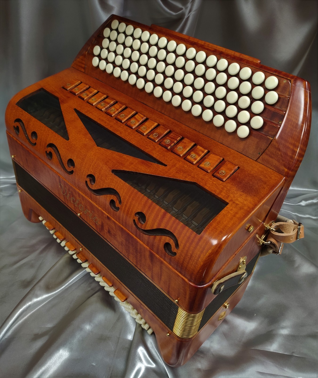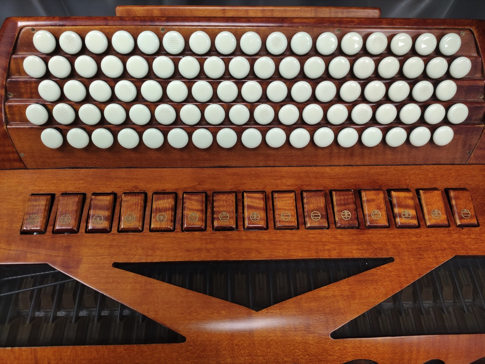 Modèle 4 voix double boite de résonance haut de gamme avec 5 rangées au chant et 120 basses. Modèle avec basson et flûte en boite de résonance, cet instrument de prestige en bois massif vous offre une diversité de sonorités complete avec 15 registres au chant.